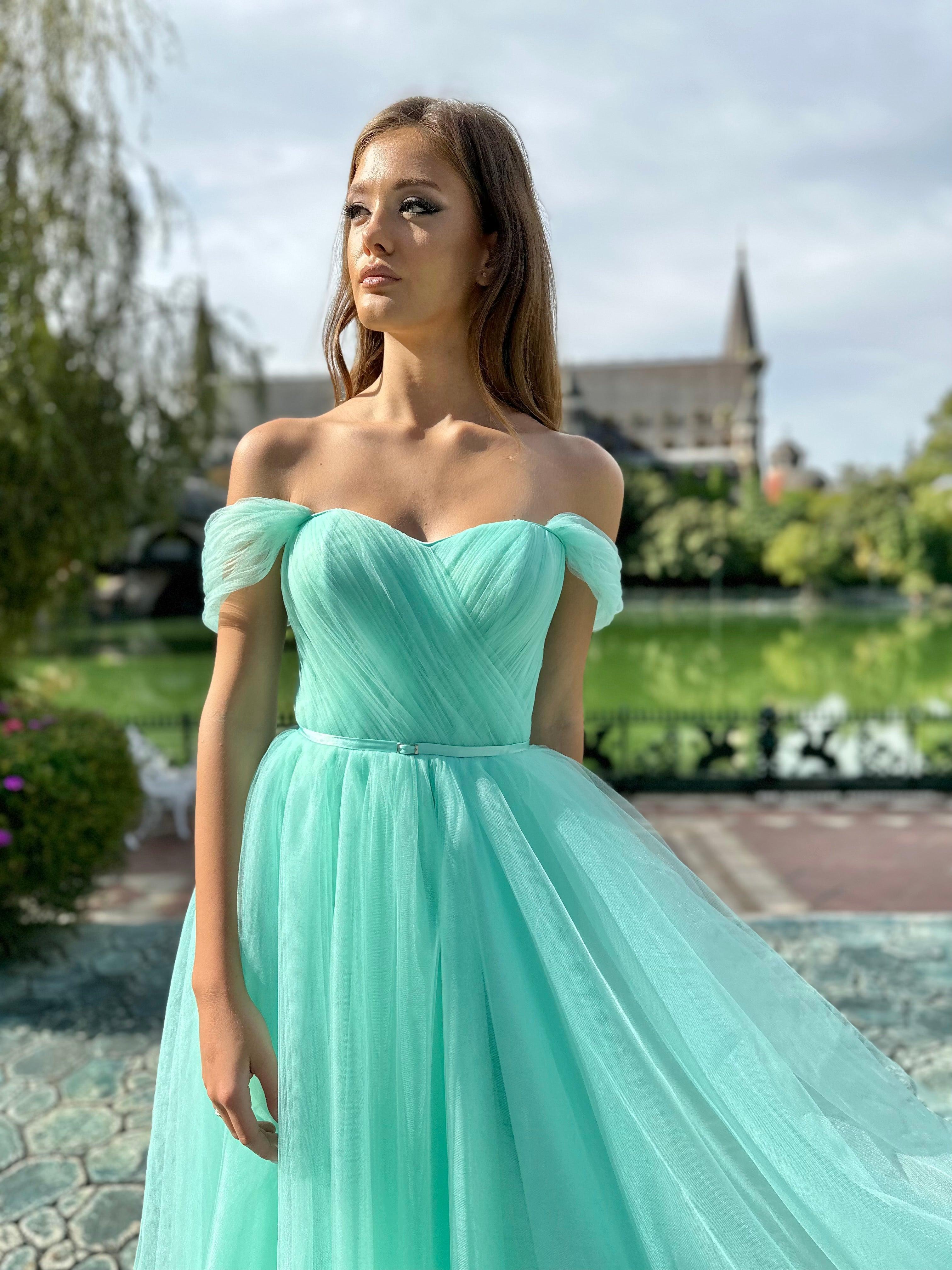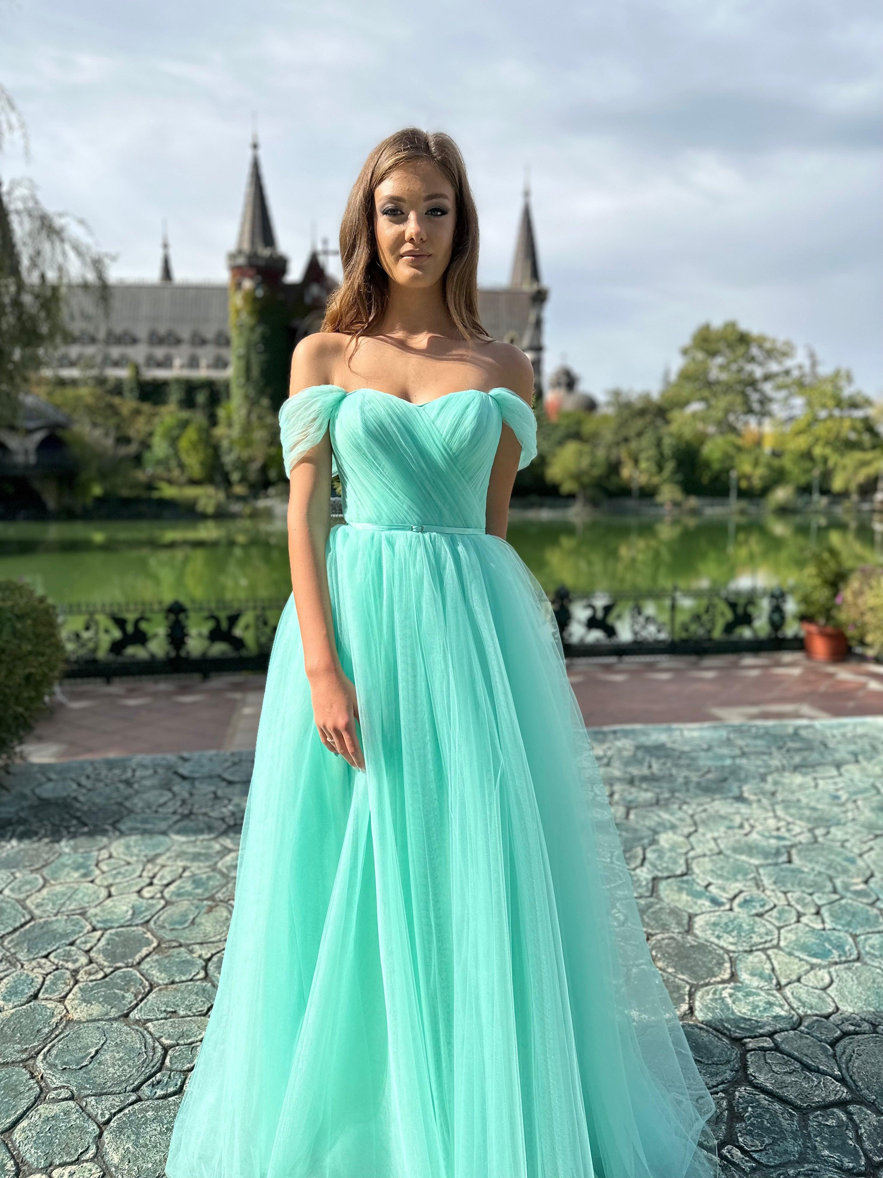 With its flowing skirt and subtle detailing, the mint green tulle gown is the epitome of grace and is perfect for special occasions or formal events.