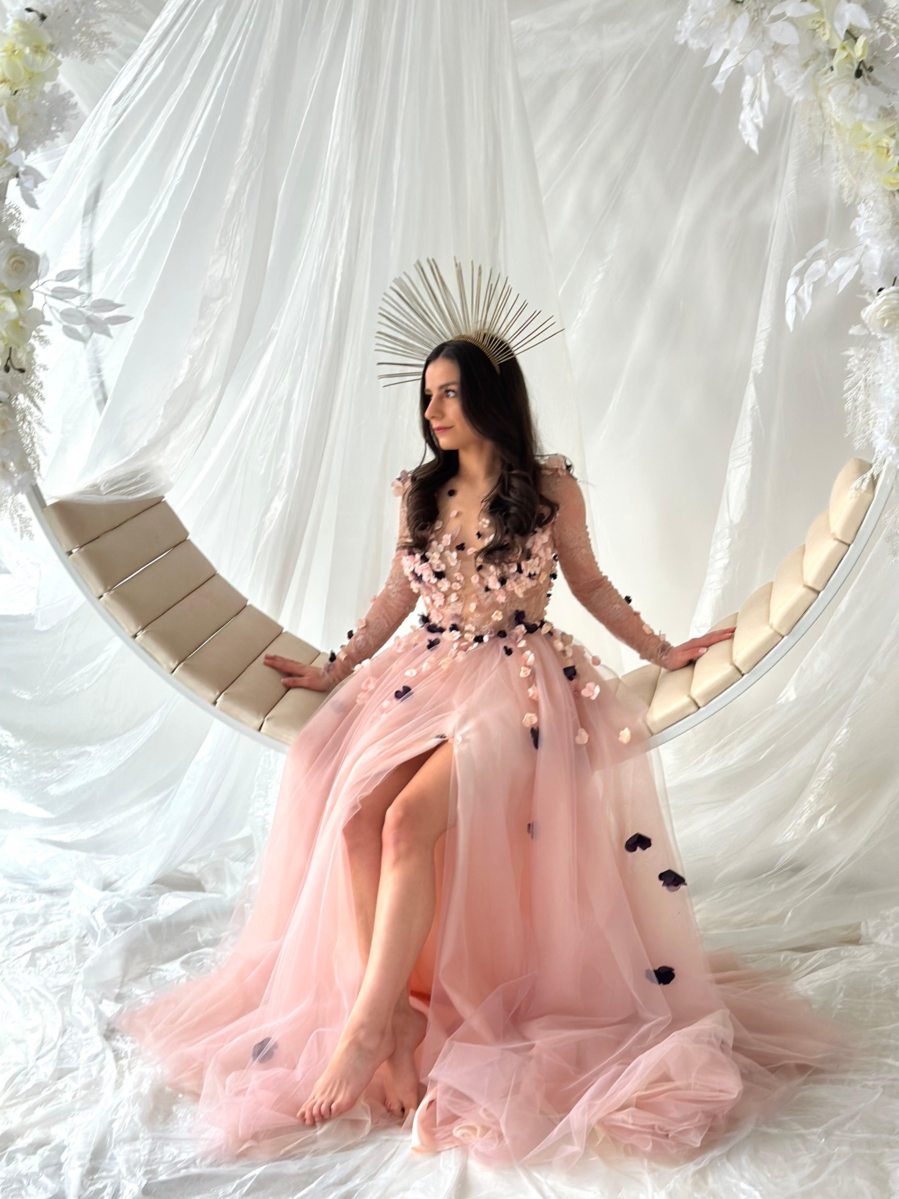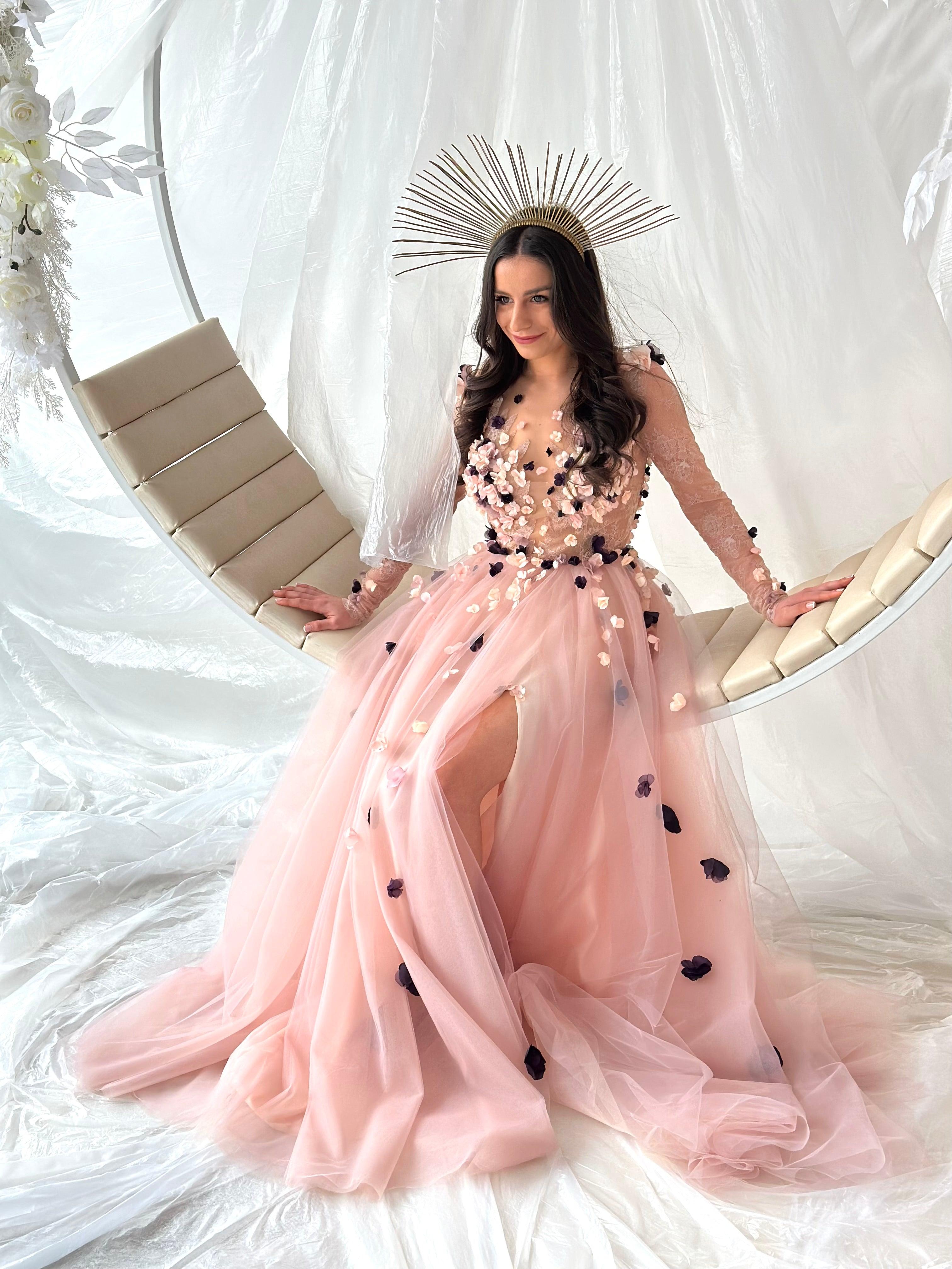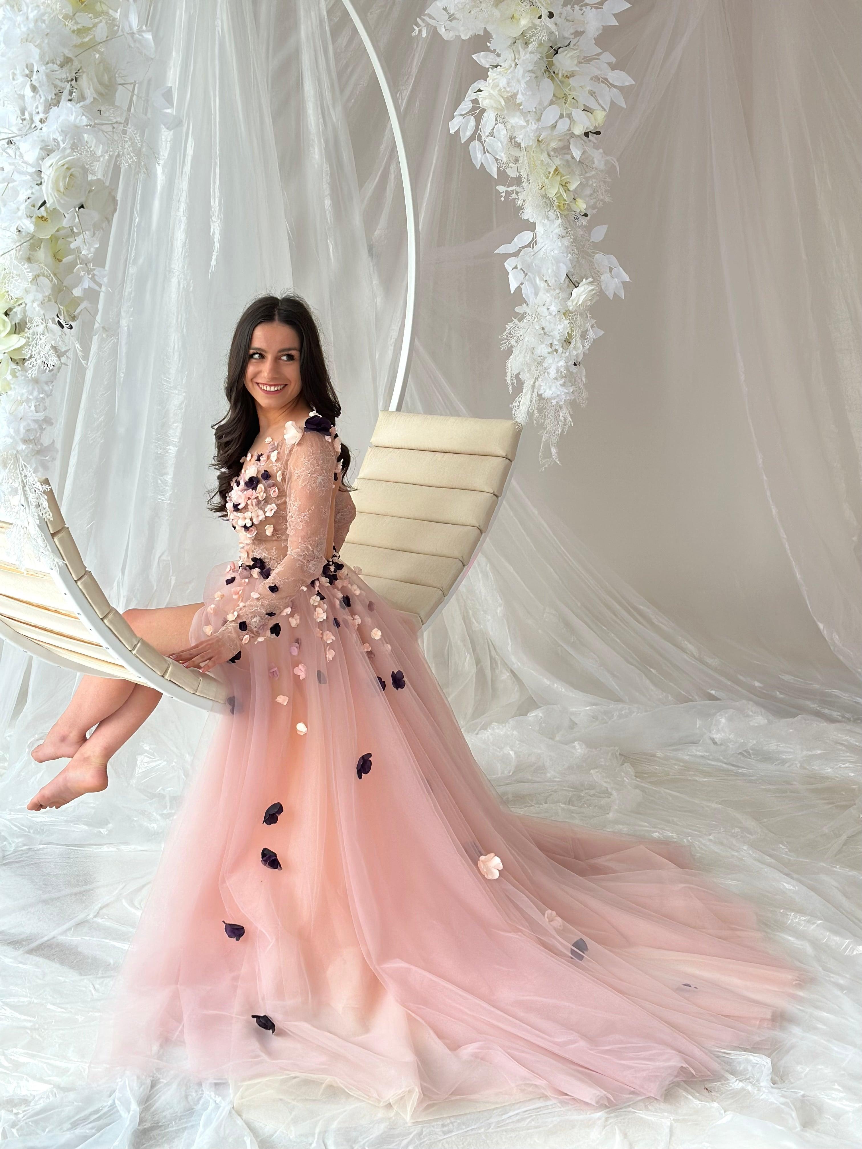 A hallmark of craftsmanship, the gown is adorned with hundreds of handmade 3D flowers, meticulously created using cut-by-laser technology and carefully sewn one by one onto the dress. The top section boasts a delicate composition of nude mesh and lace, while the skirt gracefully flows with layers of pink tulle adorned with captivating 3D flowers.