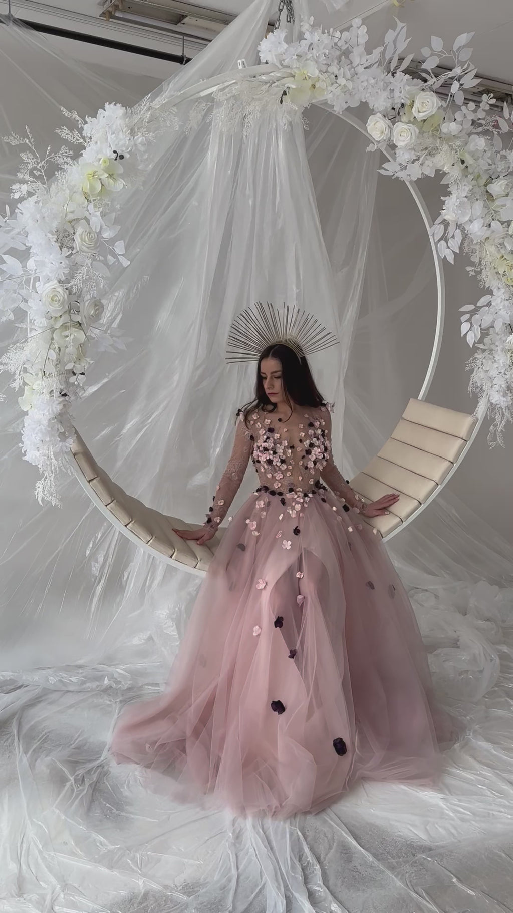 Shine on your special day in our Pink Floral Colorful Gown! Fairy floral dress is designed to captivate, closing elegantly at the back with meticulously crafted handmade buttons. The gown features an Open Back, long sleeves, and a tasteful slit that adds a touch of allure to your look.