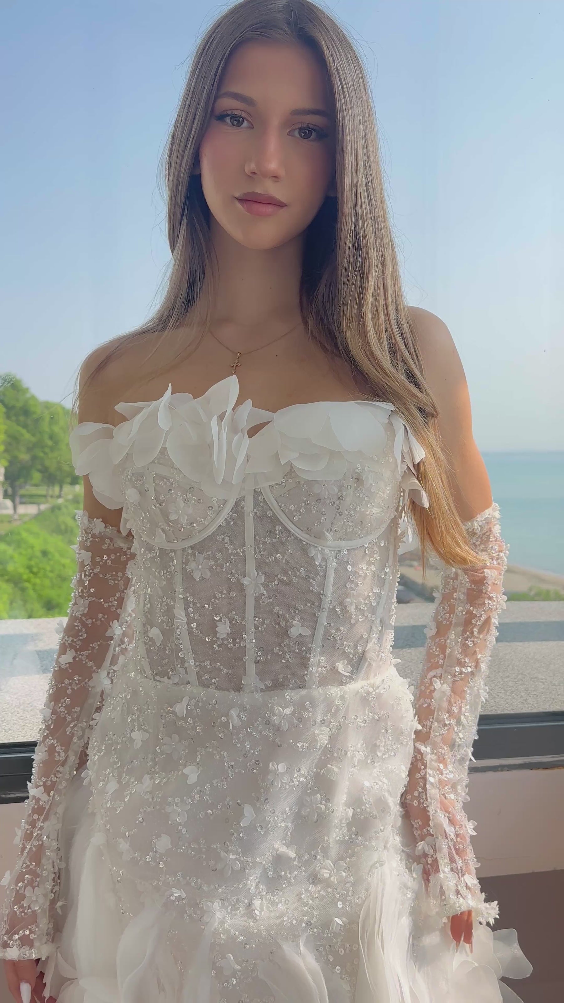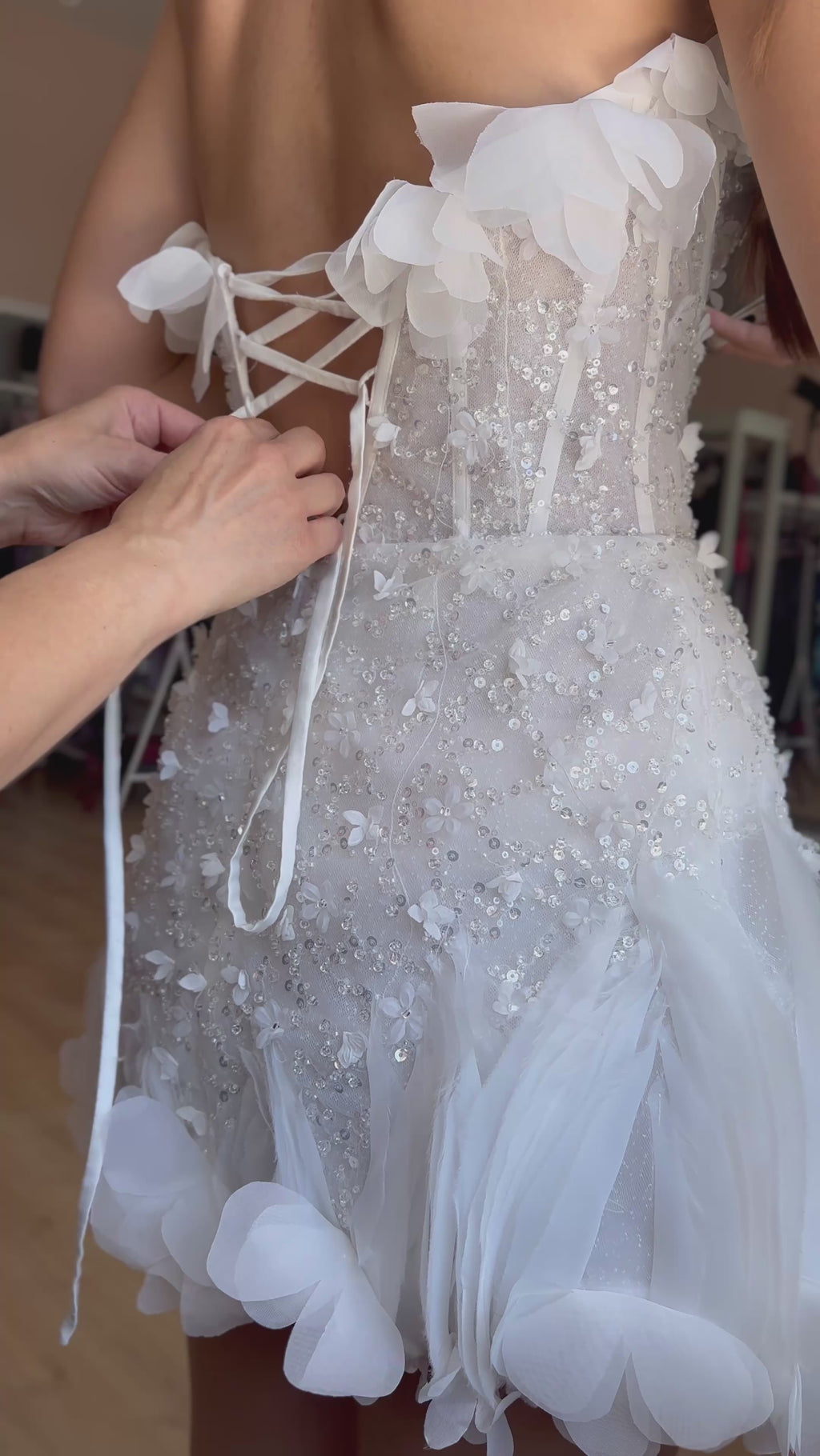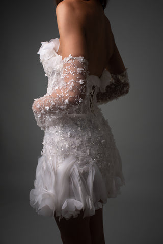 Make your special day unforgettable with the Chelsea Bridal Mini Dress, a masterpiece of elegance and sophistication. Handcrafted with premium couture French lace, this short wedding dress is adorned with intricate floral lace and finished with luxurious organza floral accents. Its chic and flattering design offers a perfect blend of timeless elegance and contemporary style. Exquisite handmade 3D flowers adorns the bodice, and bottom of the skirt, adding texture and artistry to the design. Paired with elegant matching gloves crafted from the same shimmering lace, the look achieves a harmonious balance of glamour and grace. Perfect for modern brides, elopements, receptions, bridal showers, or bridal after-party.