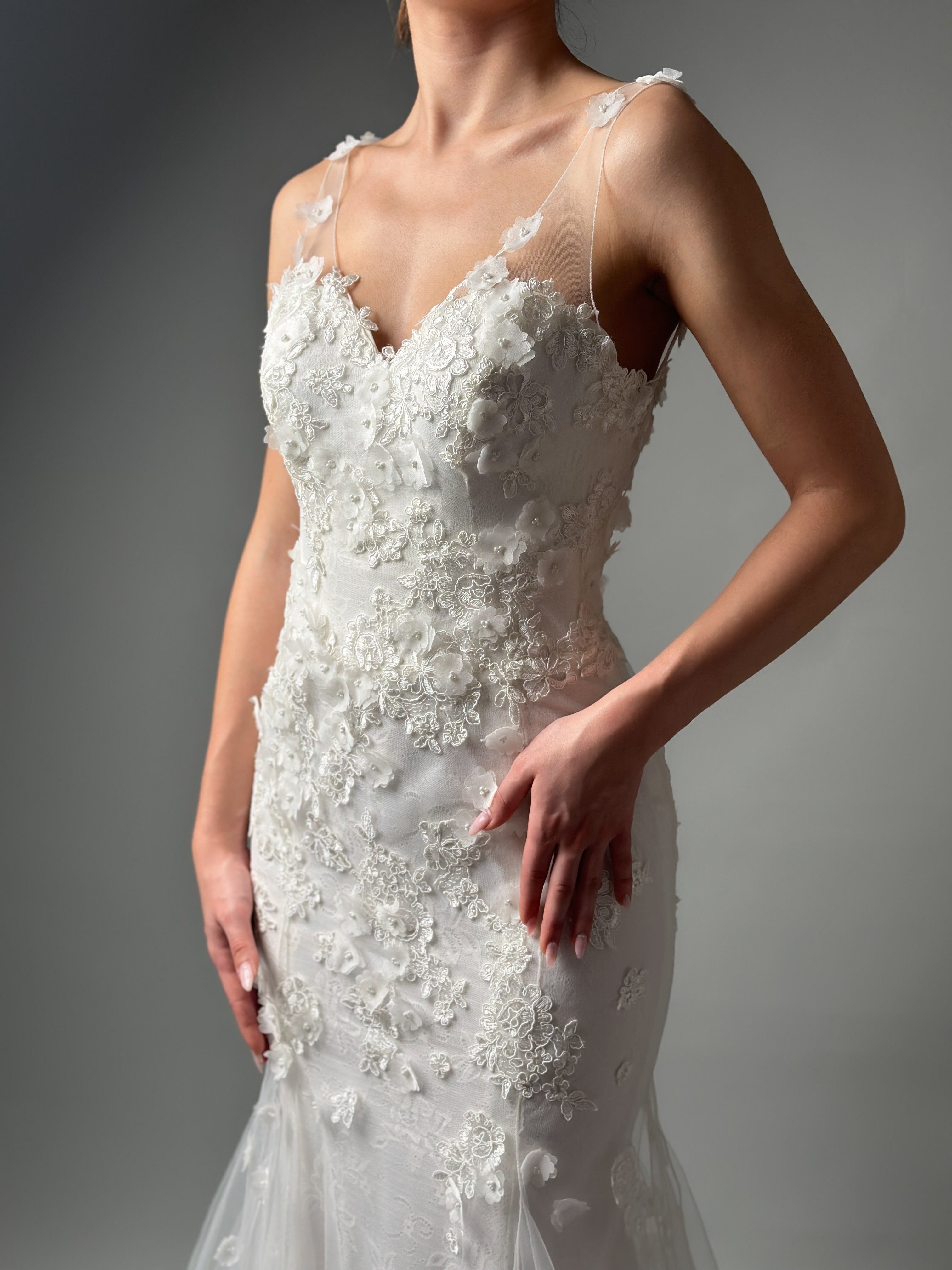Walk down the aisle in this breathtaking mermaid lace wedding dress, designed for the modern yet romantic bride. The V-neck enhances your silhouette, while the open-back detail adds a dramatic touch. Crafted with intricate floral lace, this gown exudes elegance and sophistication. The fitted bodice hugs your curves before flowing into a delicate train, perfect for creating a memorable bridal look.