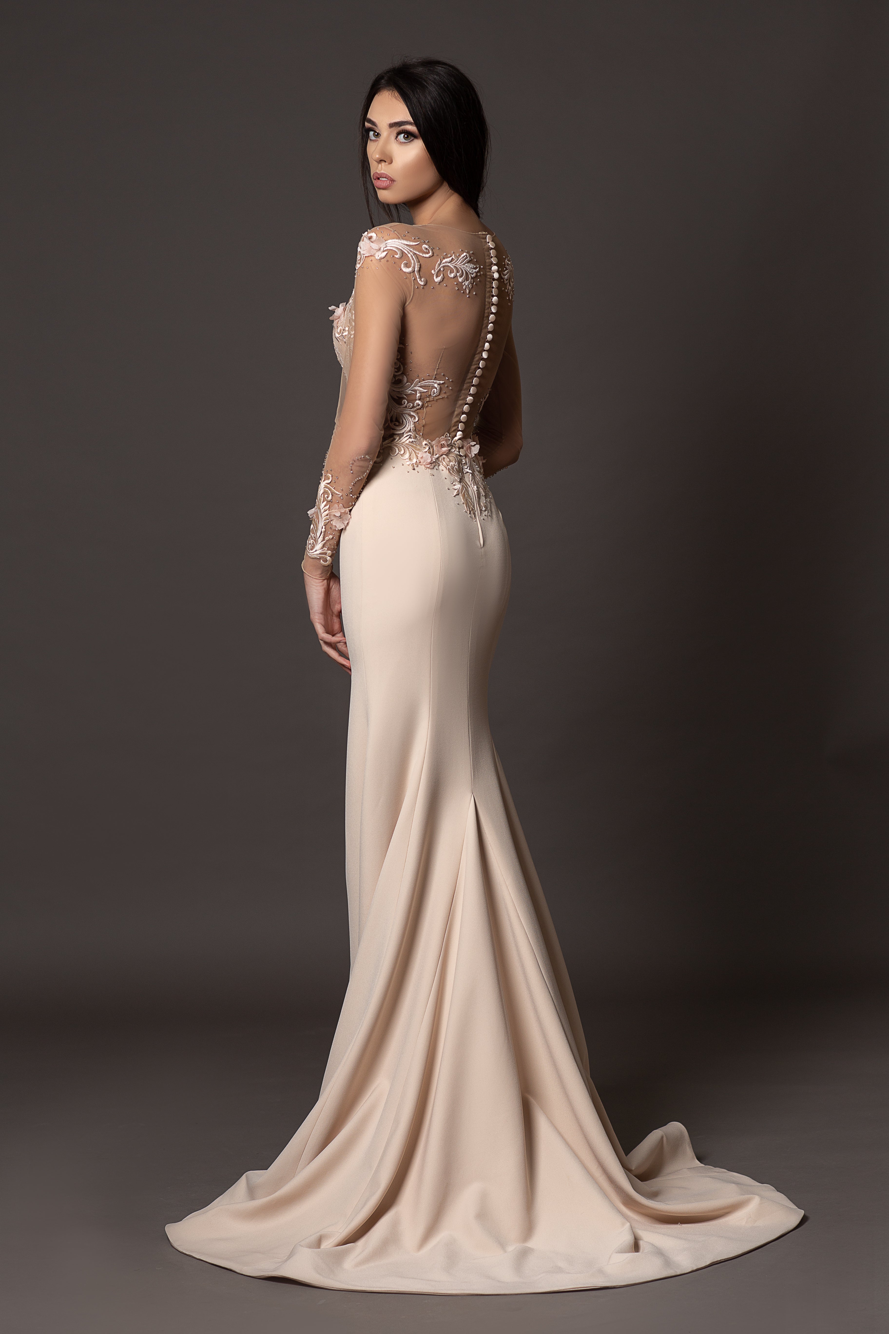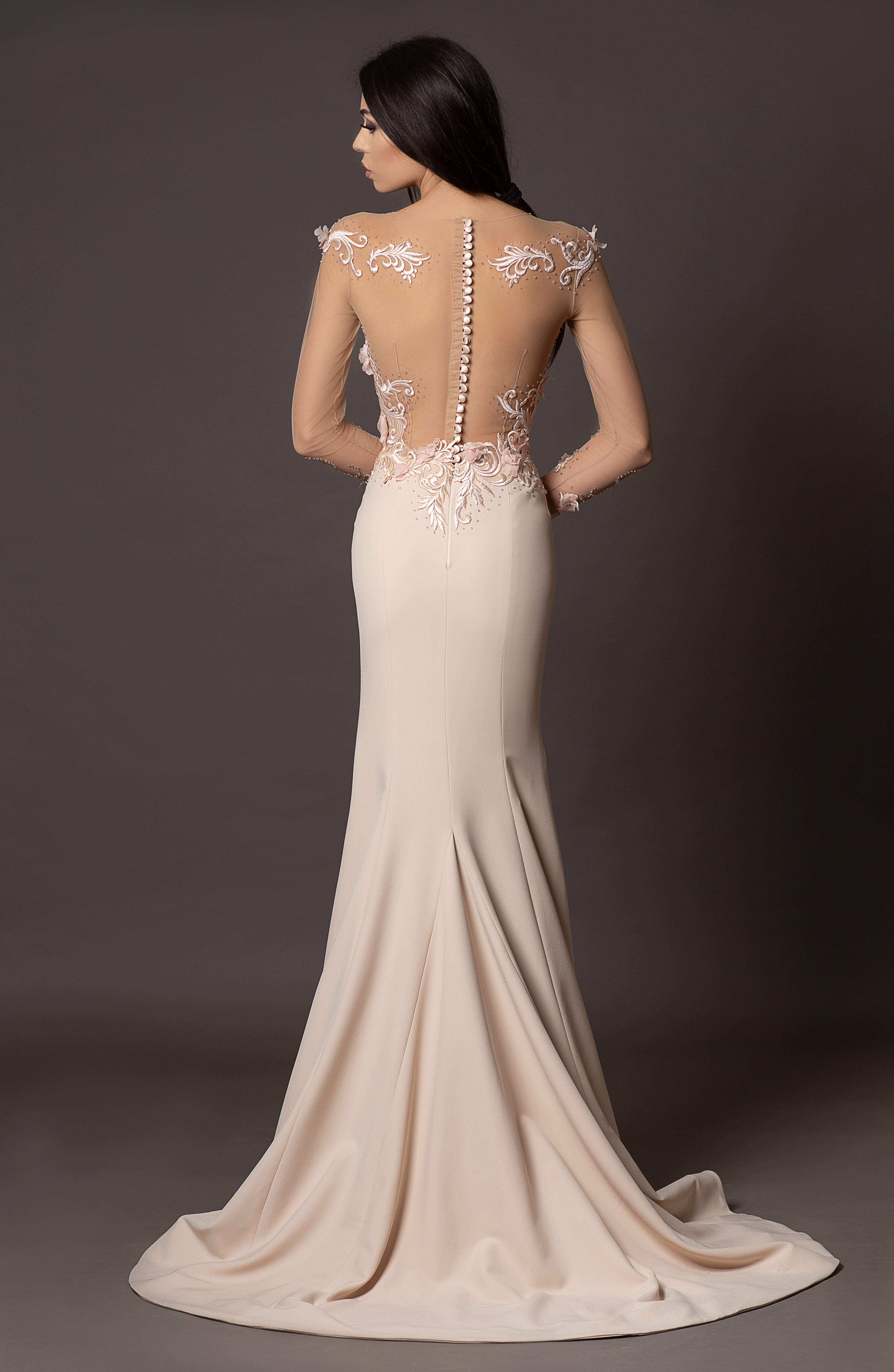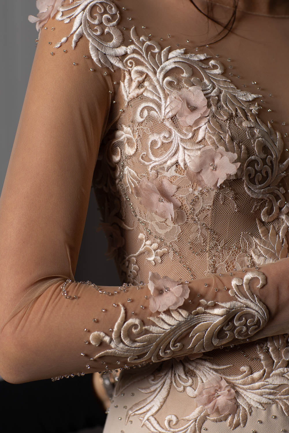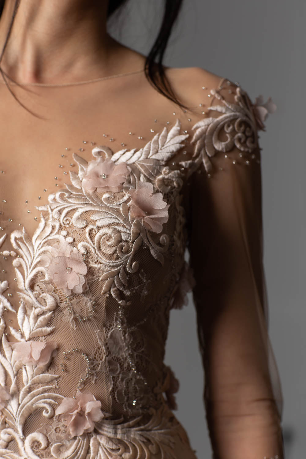 Each lace detail is carefully hand-cut and sewn, while delicately beaded accents add a touch of opulence, elevating the gown’s romantic appeal.