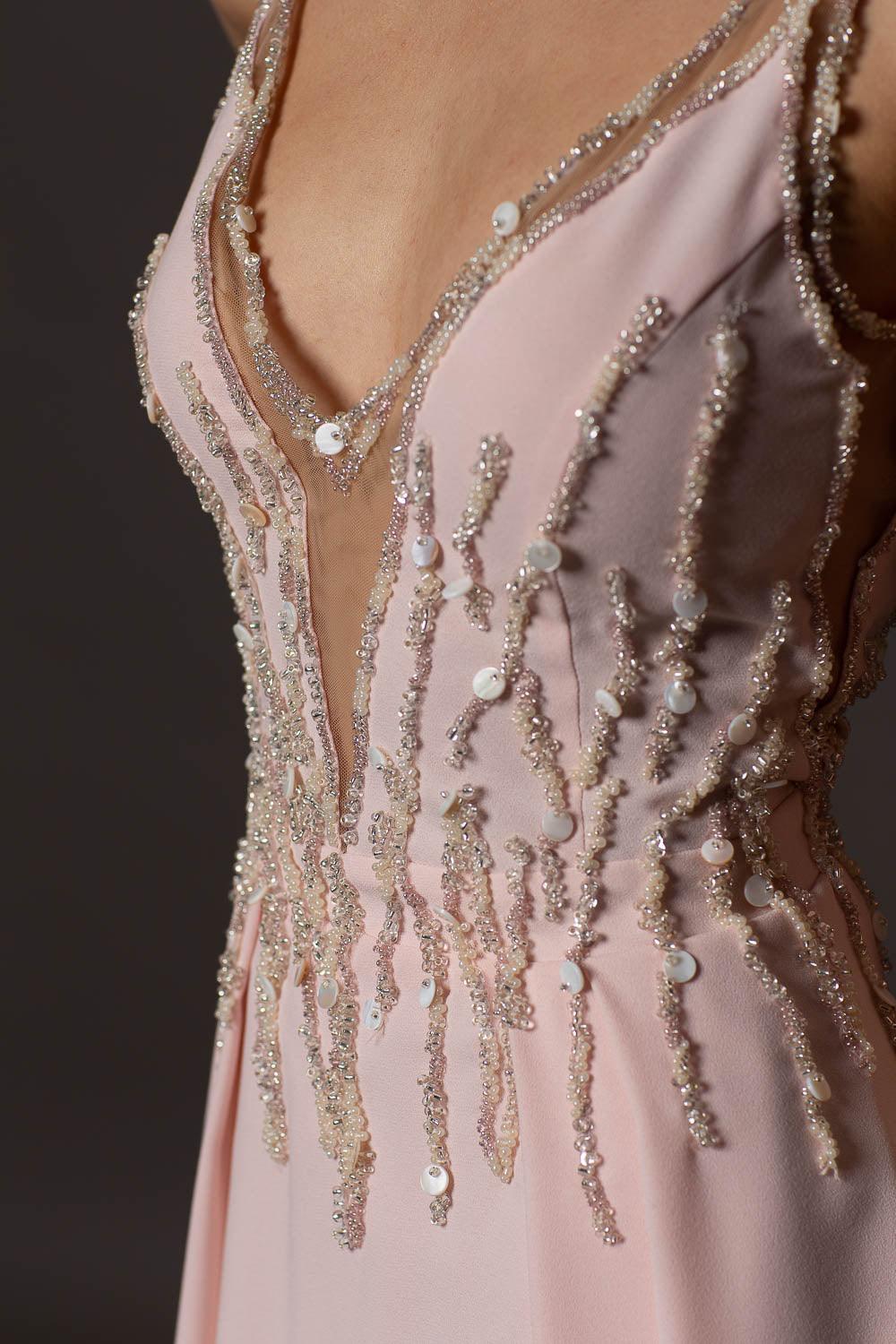 Unique beaded wedding dress boasts a striking deep V neckline, an alluring open back, and a gracefully flowing A-line silhouette. The intricately designed bodice is a masterpiece of hand-embroidery, adorned with glistening pearls and crystals that catch the light with every movement. Fashioned from the finest soft pink georgette, this bridal gown exudes a delicate and romantic charm.