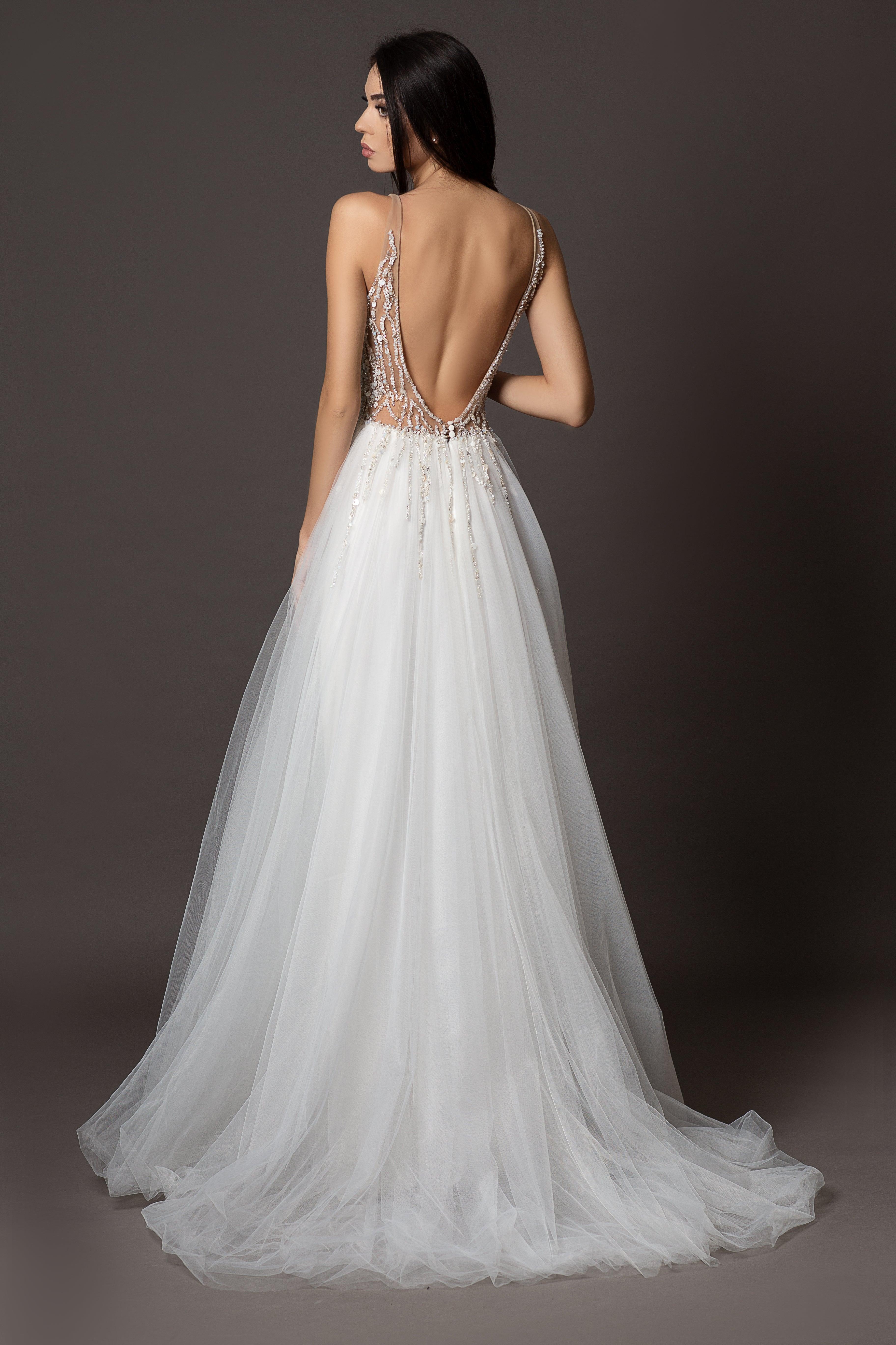 The ethereal skirt, fashioned from delicate tulle, gracefully flows and is accompanied by a satin lining that caresses your skin with utmost gentleness. The open back introduces an additional layer of allure, elevating the gown's overall sensuality. Beyond the classic white, this exquisite dress can be tailored in a myriad of colors, allowing you to personalize your dream wedding ensemble.