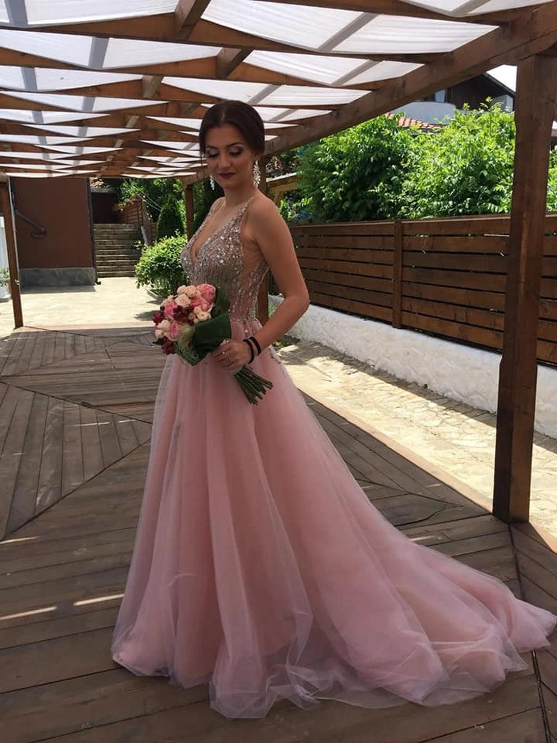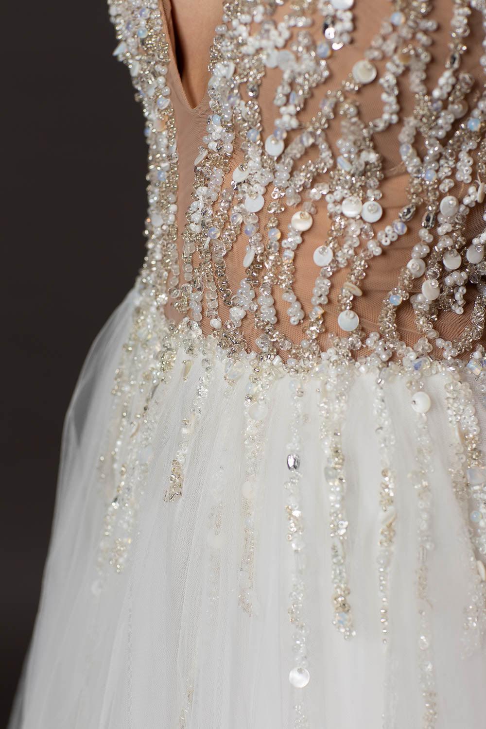Elegantly showcasing a captivating A-line silhouette, sexy wedding dress exudes sophistication. The deep V-neck adds a touch of allure, offering the option to be elegantly closed for a more conservative aesthetic. Meticulously crafted by hand, the entire bodice sparkles with thousands of meticulously placed beads, creating a breathtaking and luxurious effect.
