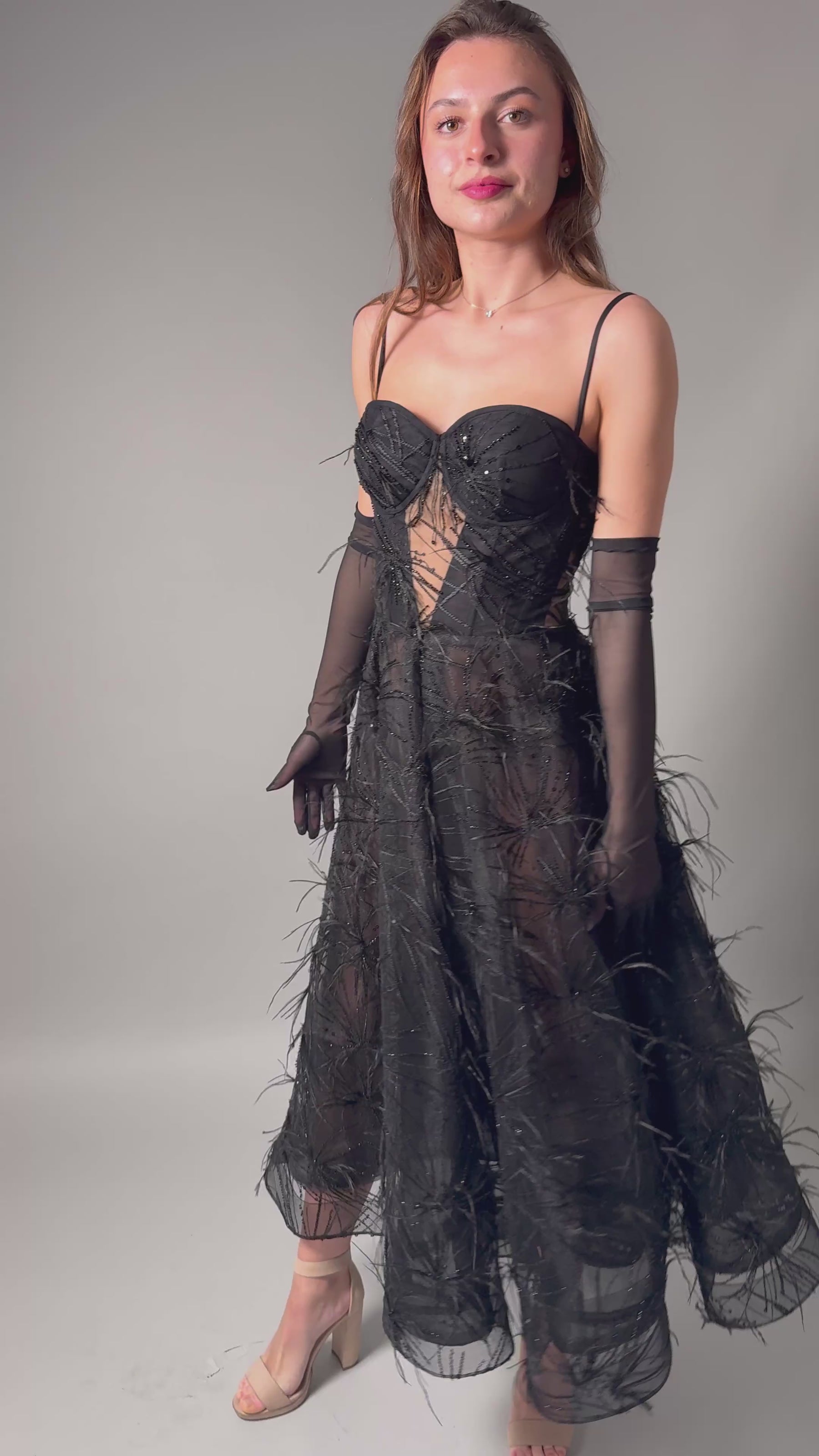 Black Elegant Couture Gown A-Line Midi with Ostrich Feathers