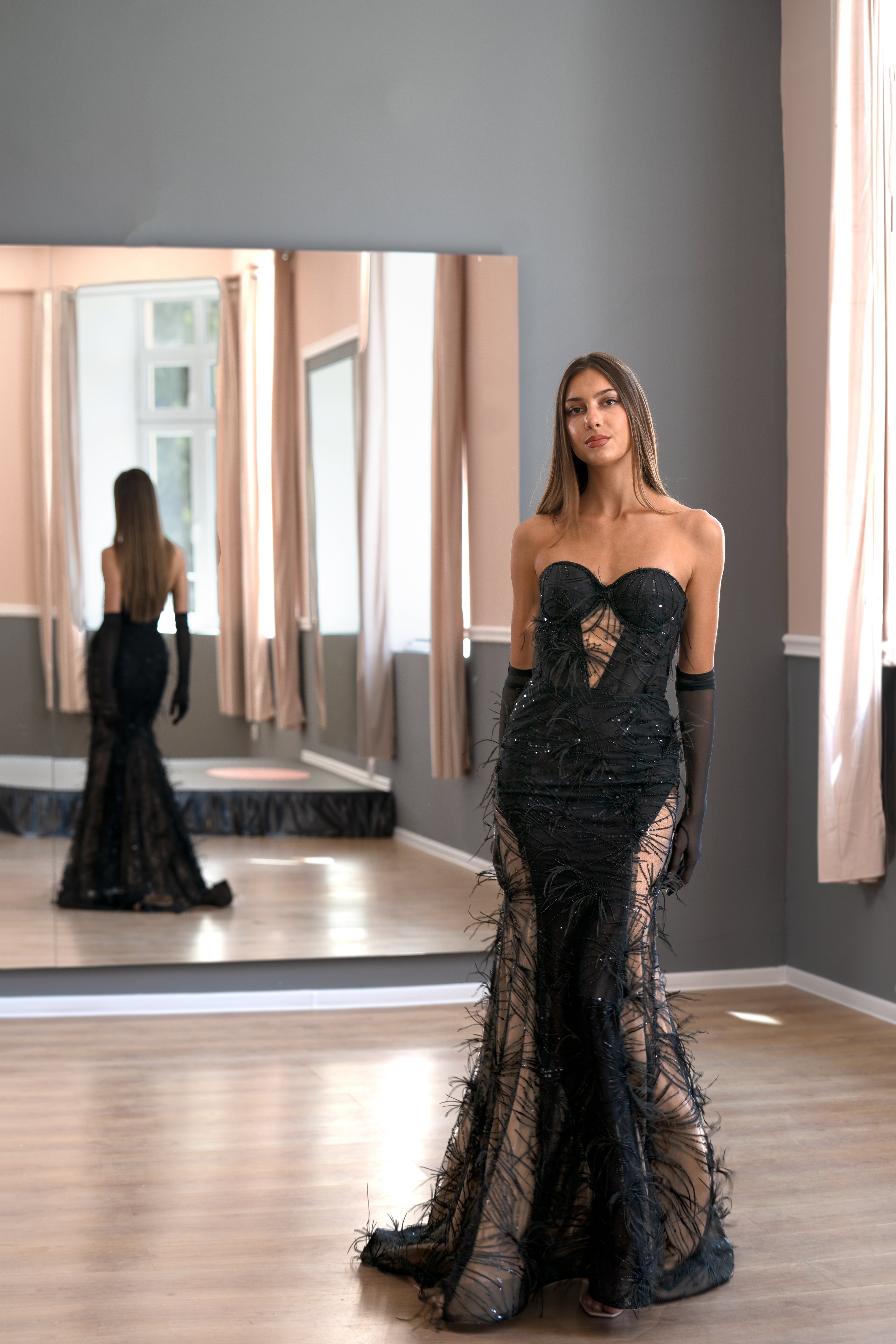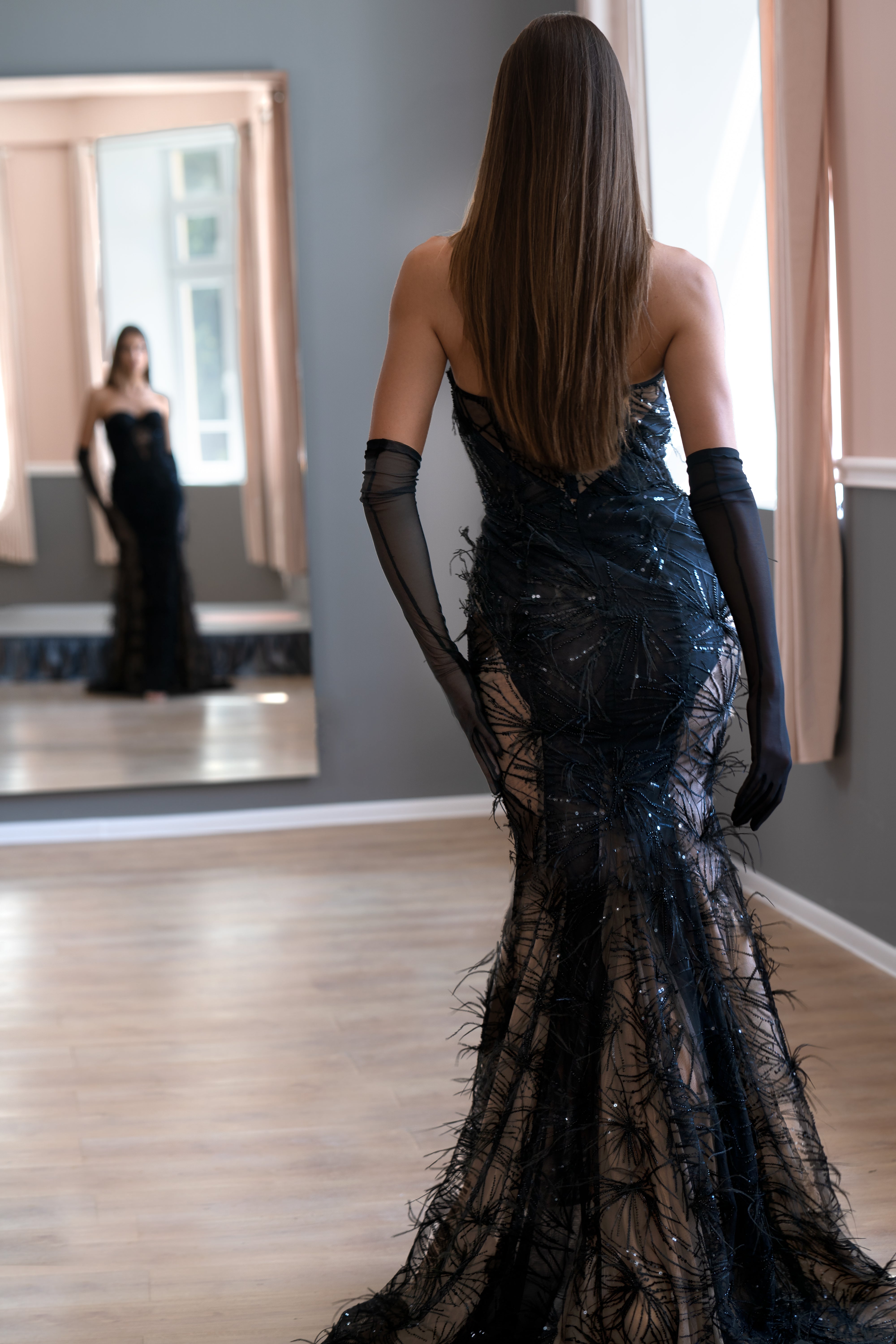 Dramatic mermaid black lace gown crafted from couture French lace, detailed with hand-applied beads and feather accents for a rich, textured finish. The sculpted silhouette is designed to enhance the figure, while nude illusion panels add modern depth and soft contrast.