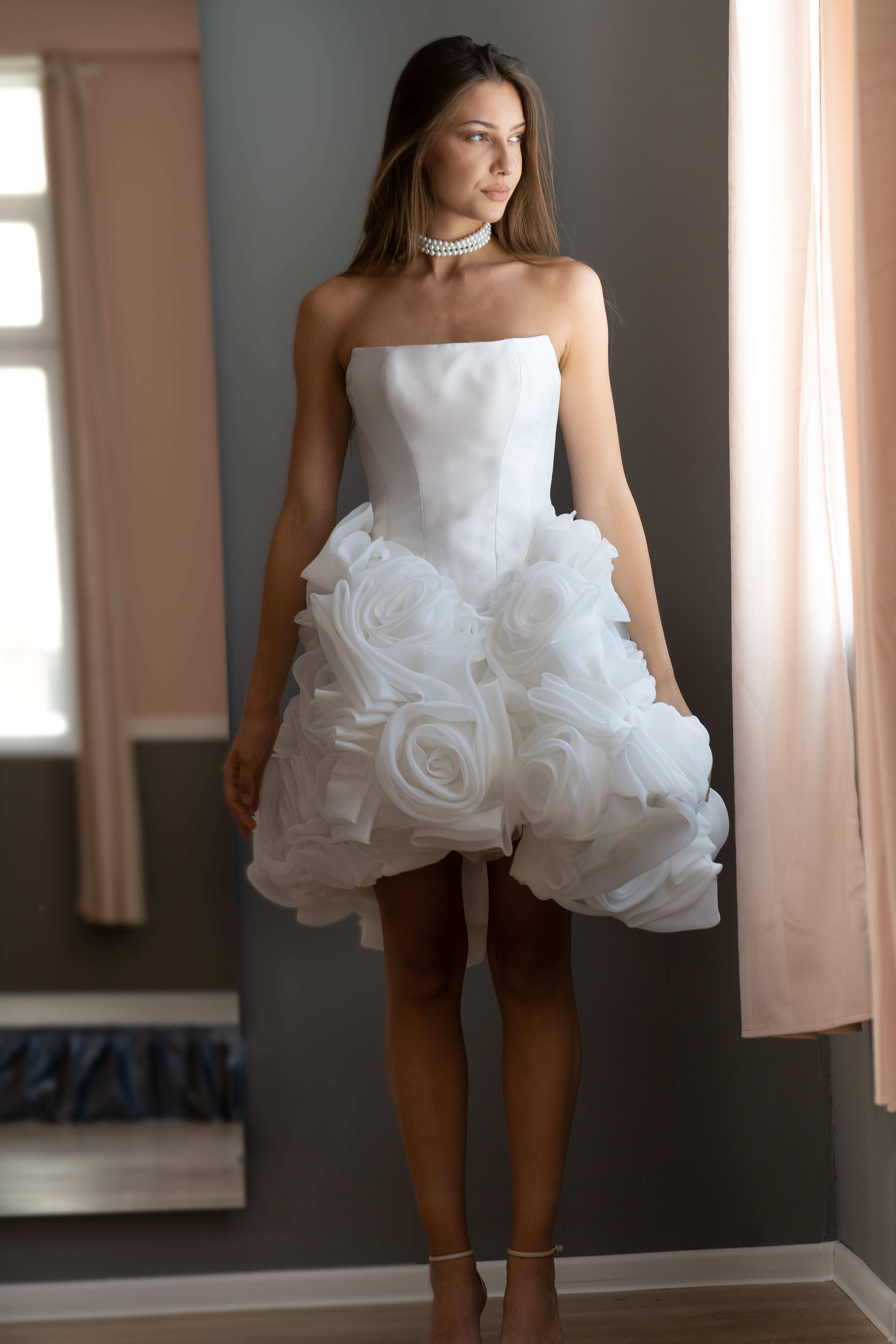 Show-stopping flowered basque waist corset dress with a midi skirt decorated with 3D flowers and ruffles, made of a dozen meters of organza. Separate silky Mikado bodice is designed with a straight neckline, flattering low waist, built-in cups, and a lace-up back for an elegant hourglass fit. A-line midi gown is light, romantic, and full of movement—a perfect choice for a bride who wants something unique and graceful.