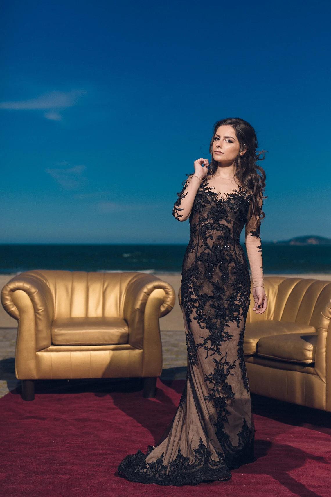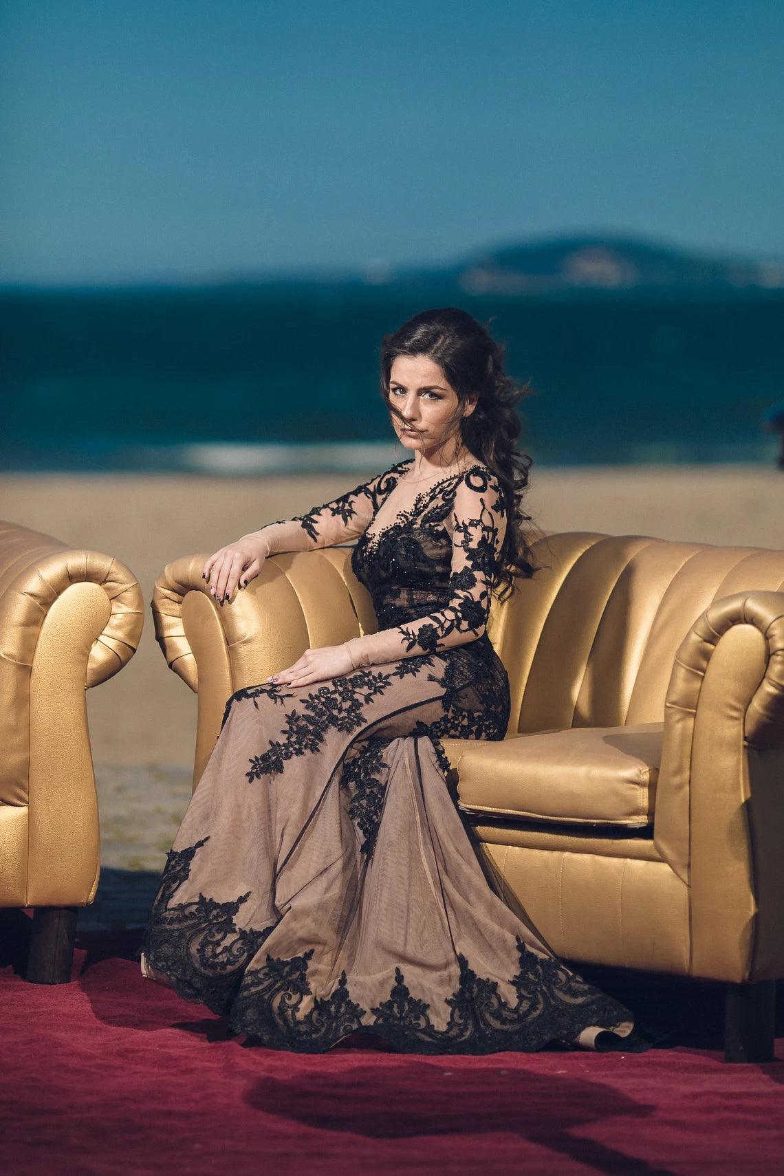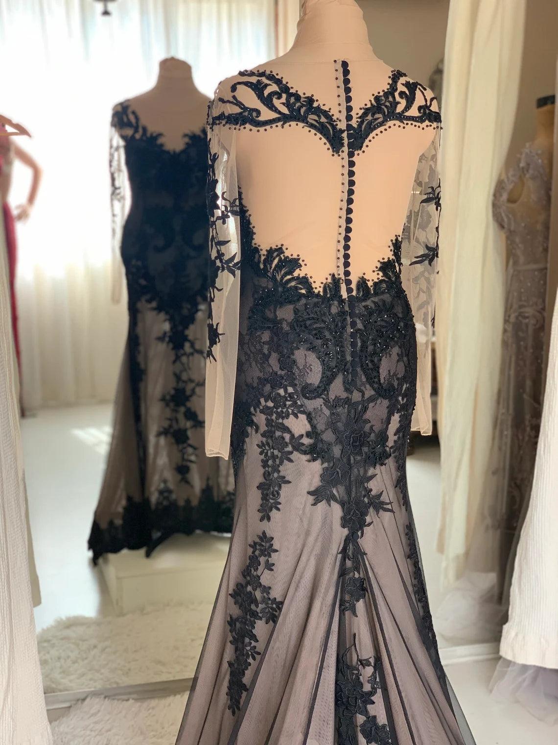 Black Lace Gown with its gracefully elongated sleeves embodies a rare fusion of delicate craftsmanship and meticulous artistry. Meticulously crafted from the finest French lace, each thread intricately woven by skilled hands, this gown epitomizes sophistication and allure. Its intricate design, adorned with high-quality beads, adds a touch of opulence and refinement, elevating it to a true masterpiece of couture.