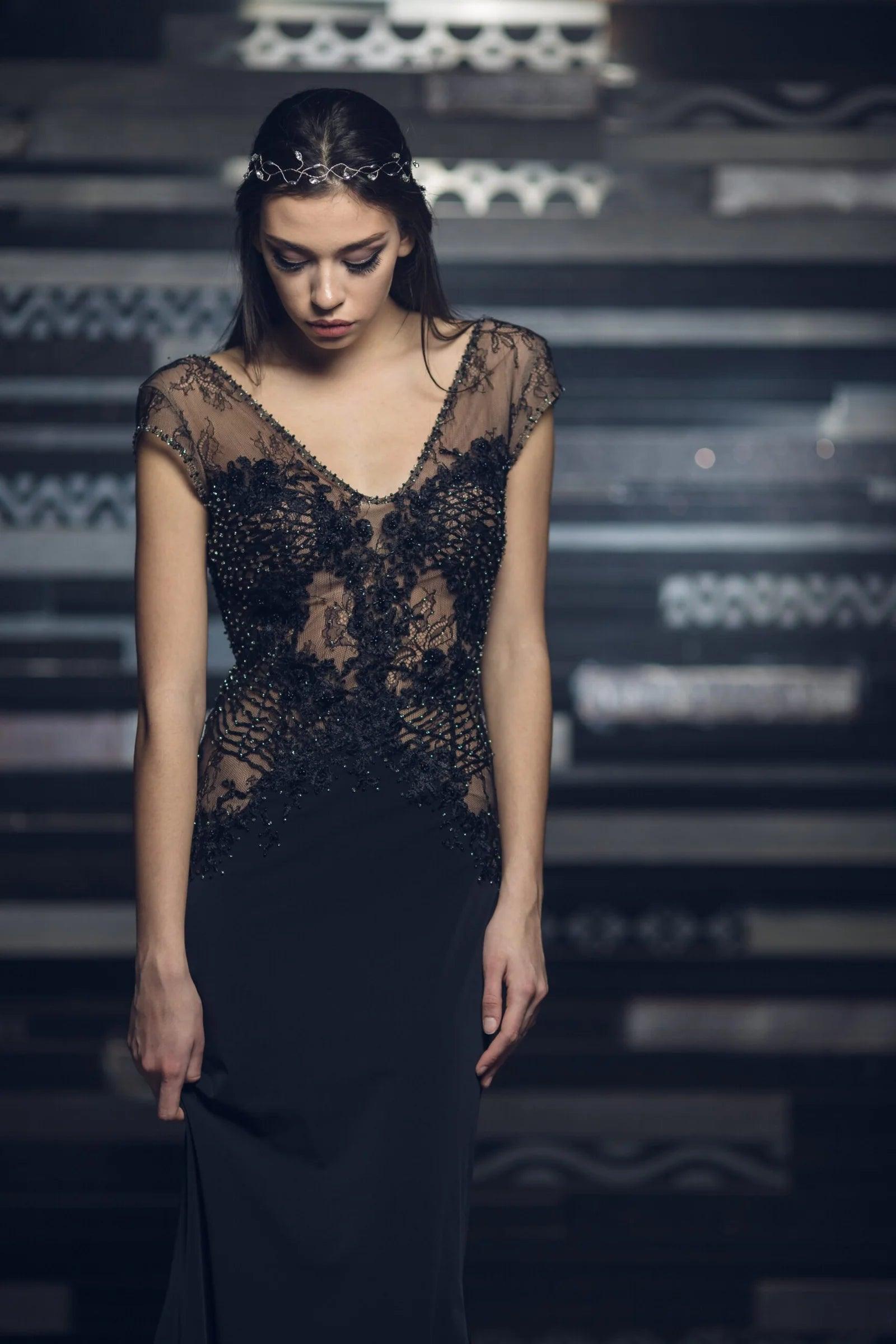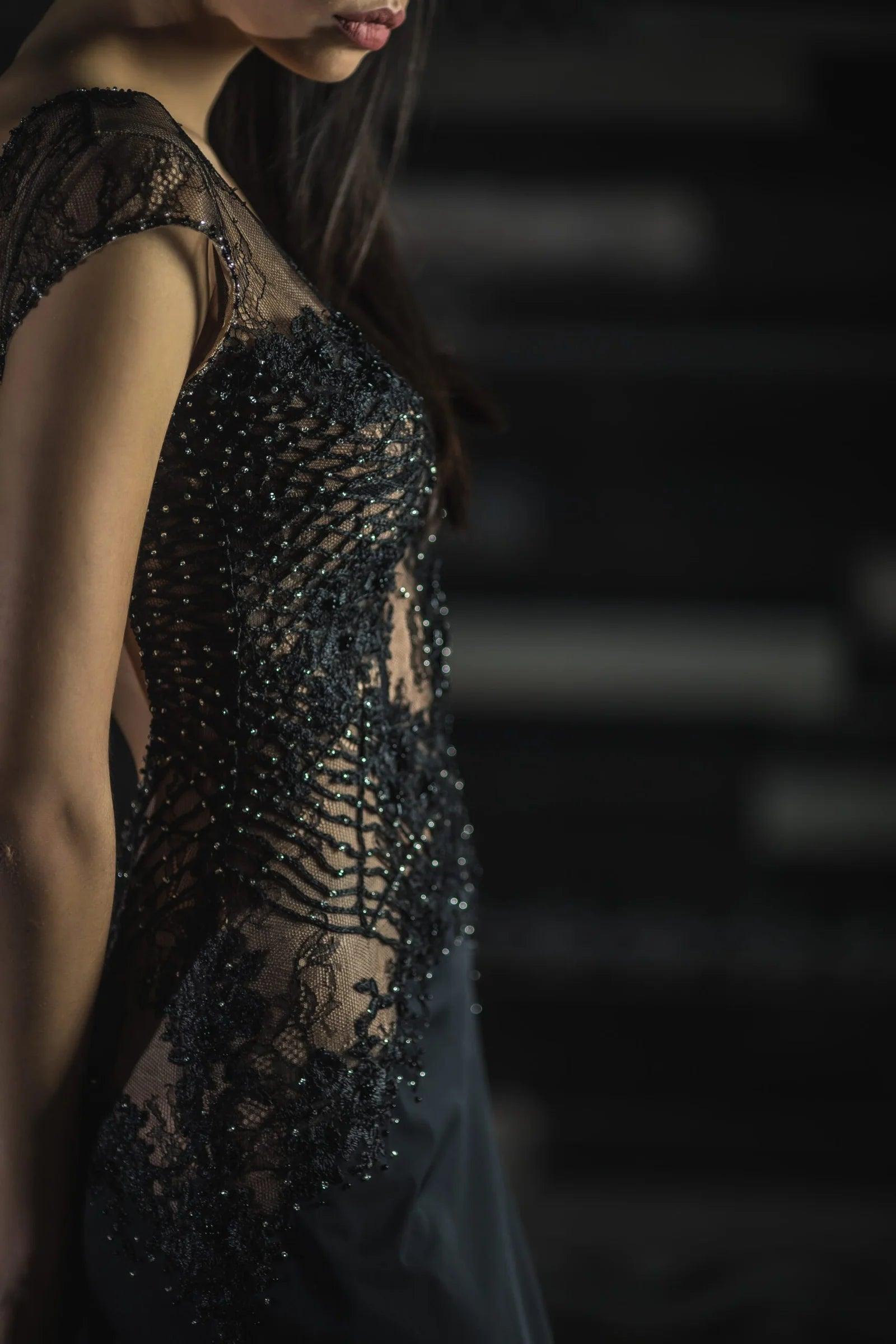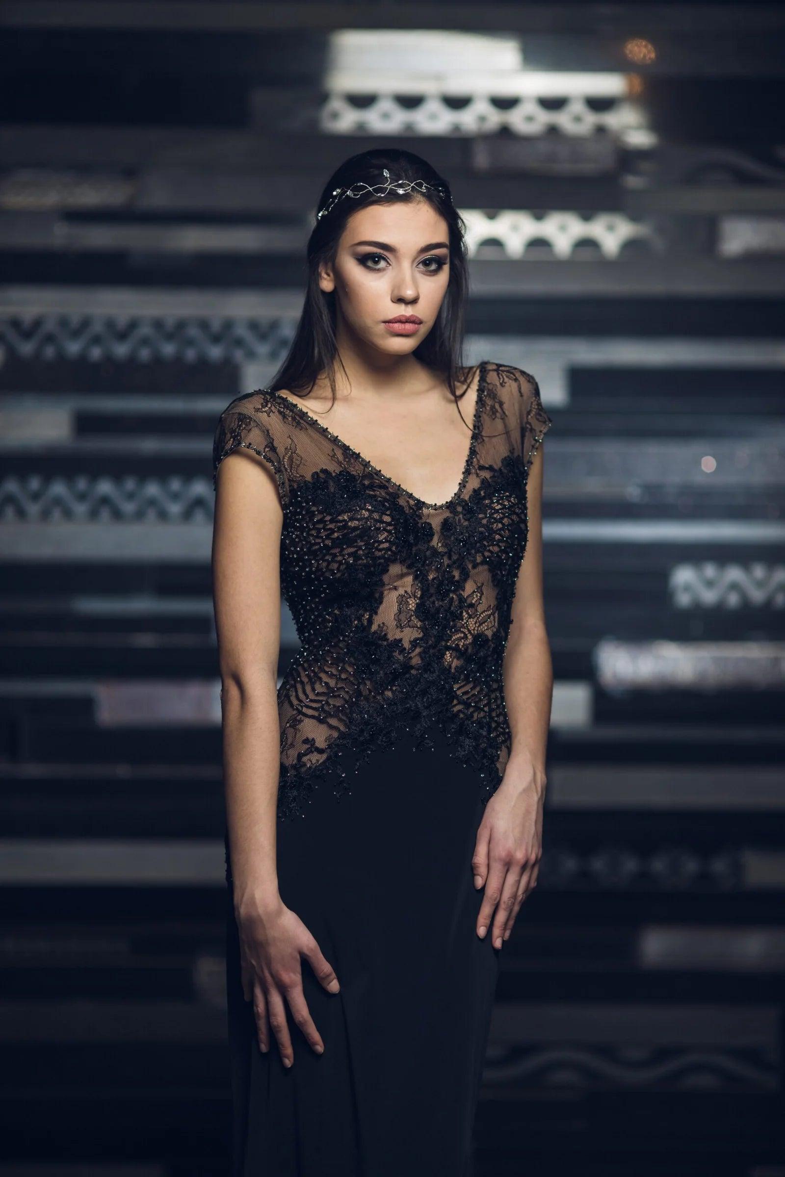 Exquisite gown, crafted from delicate Italian lace of the highest quality, exudes timeless sophistication. With its alluring mermaid silhouette and a sumptuous Lycra skirt, it embodies the essence of classic beauty. The bodice is adorned with meticulously hand-cut lace ornaments and glistening pearls, adding a touch of opulence to your special day.