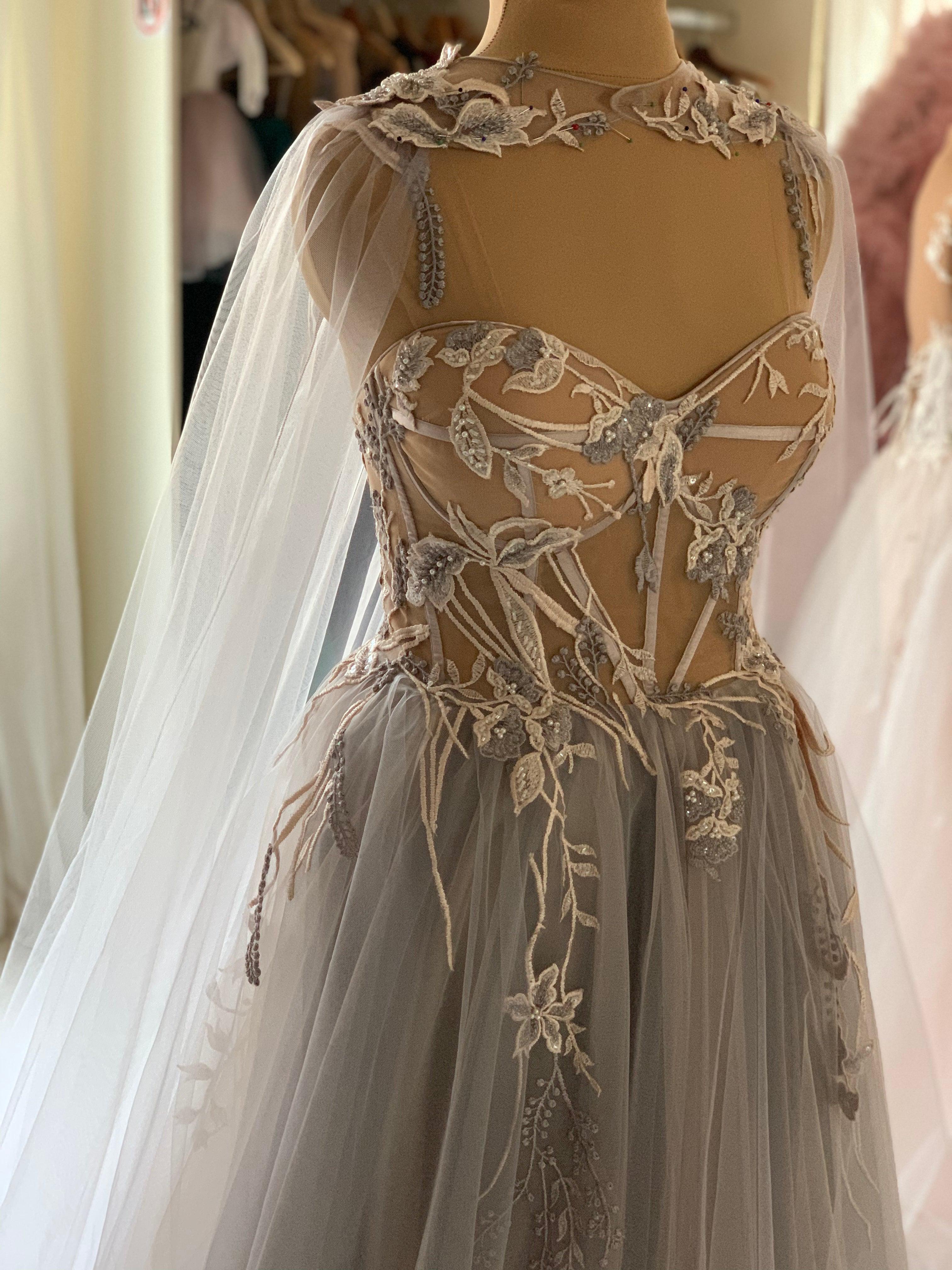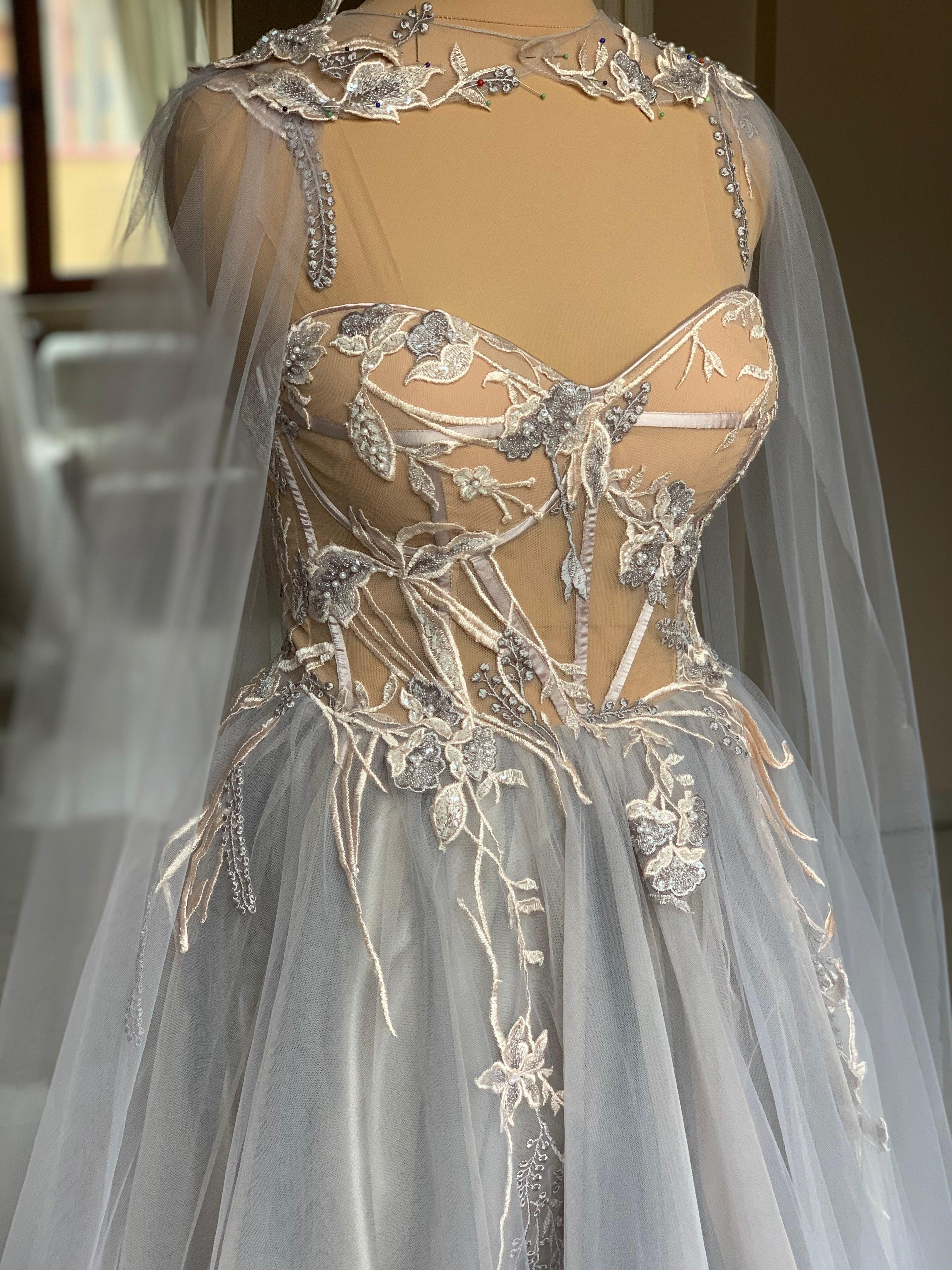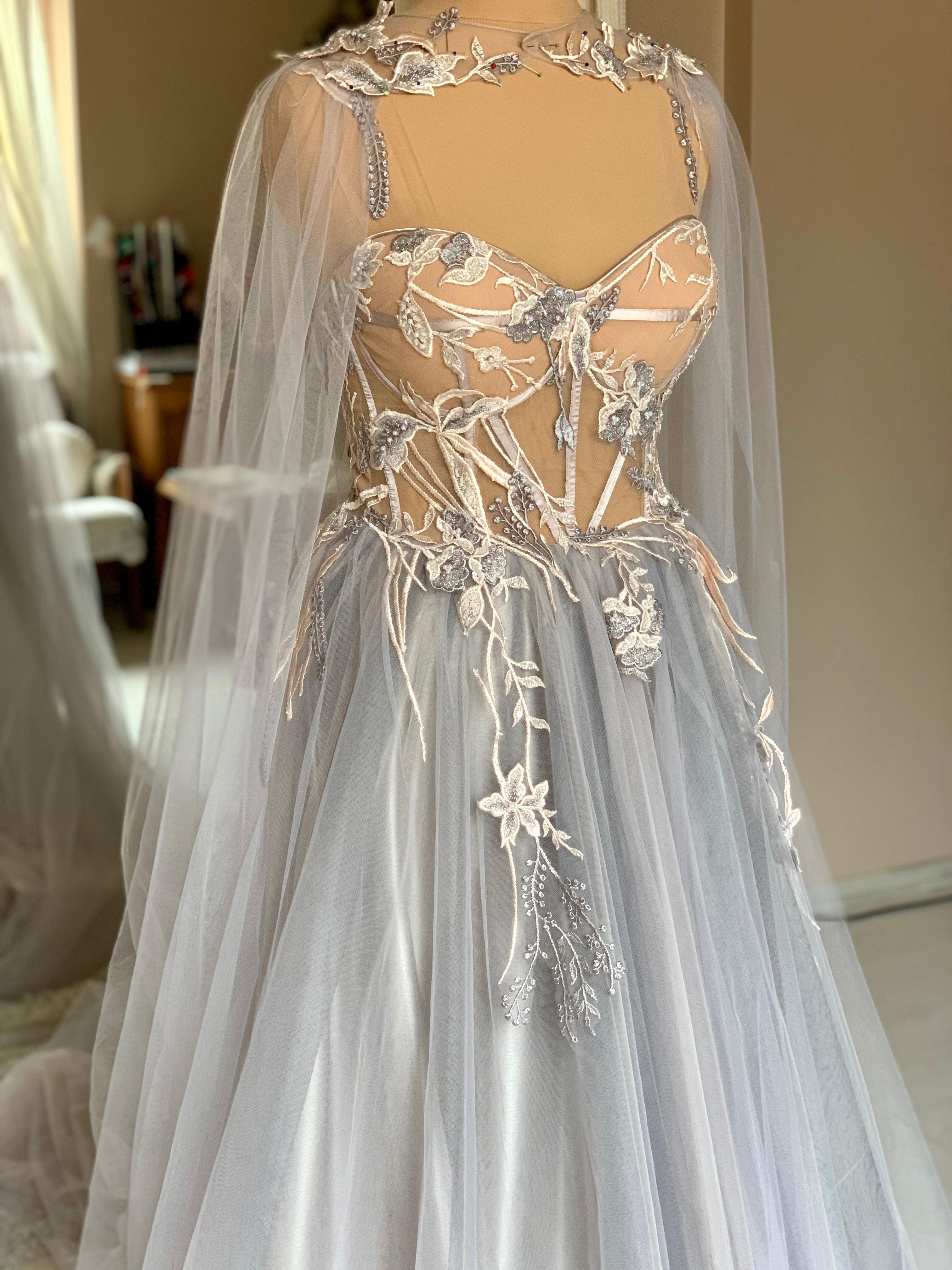Designed to complement your dress flawlessly, the Whimsy Cape Veil is a masterpiece of craftsmanship and artistry. Whether you're saying "I do" in a lush garden or dancing under the stars, this enchanting accessory will elevate your bridal look to celestial heights, ensuring that all eyes are on you as you embark on your journey of love and enchantment.