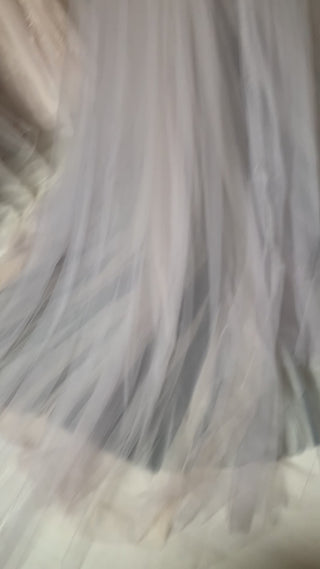 Imagine yourself adorned in a cascade of tulle, gracefully draping from your shoulders like a wisp of cloud-kissed air. The soft, translucent fabric billows and flows with every movement, creating an aura of enchantment around you as you glide down the aisle.
