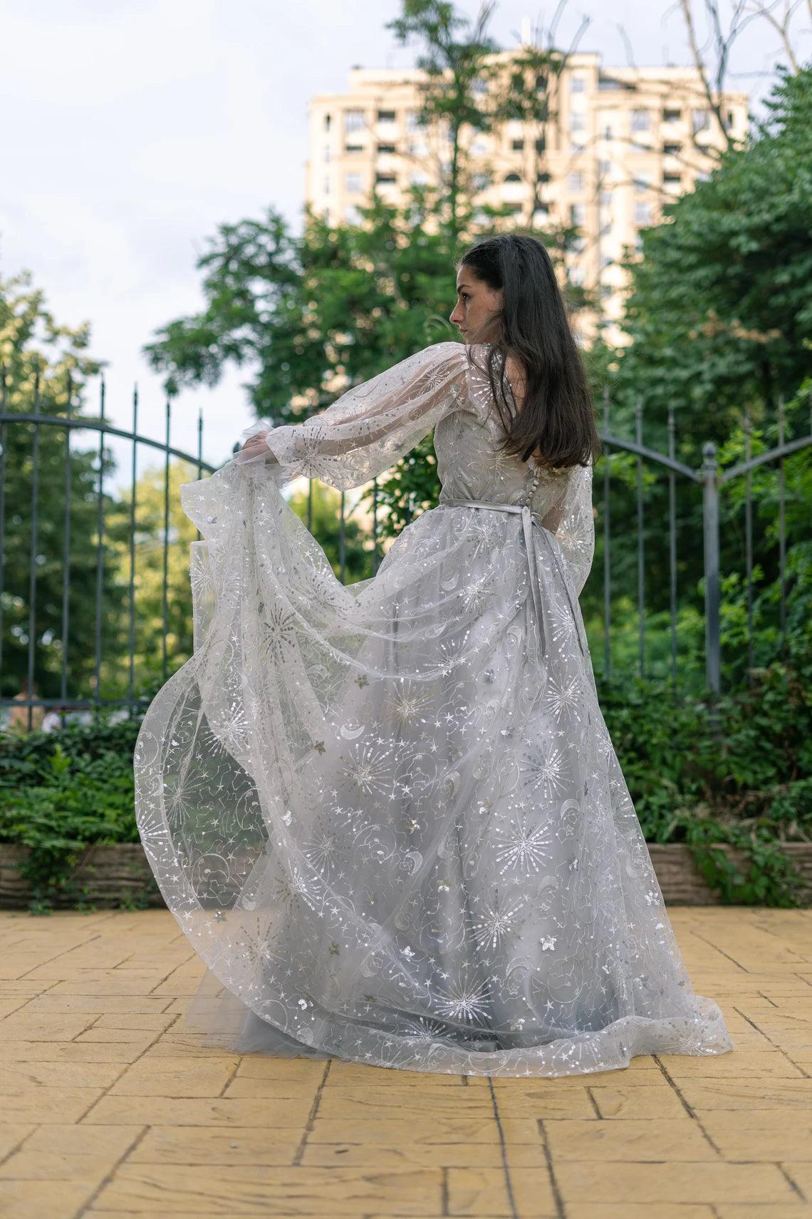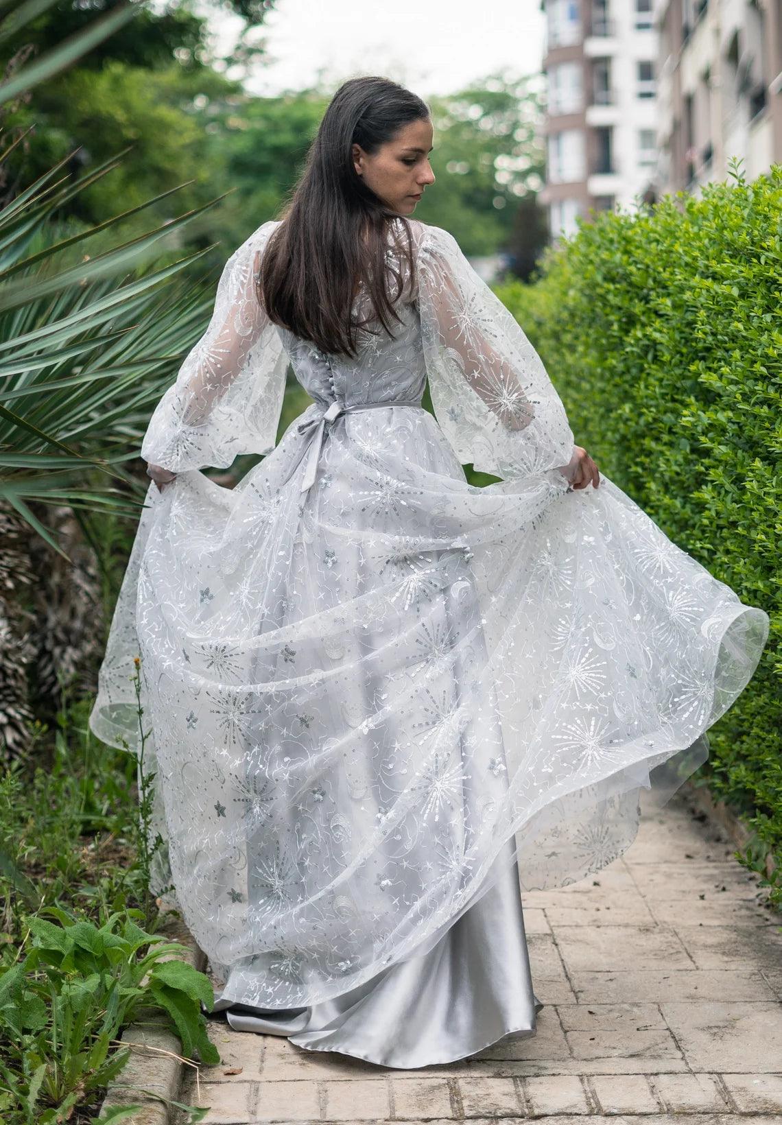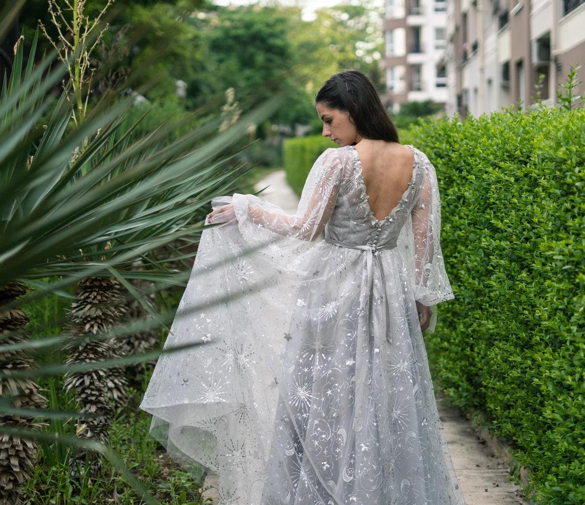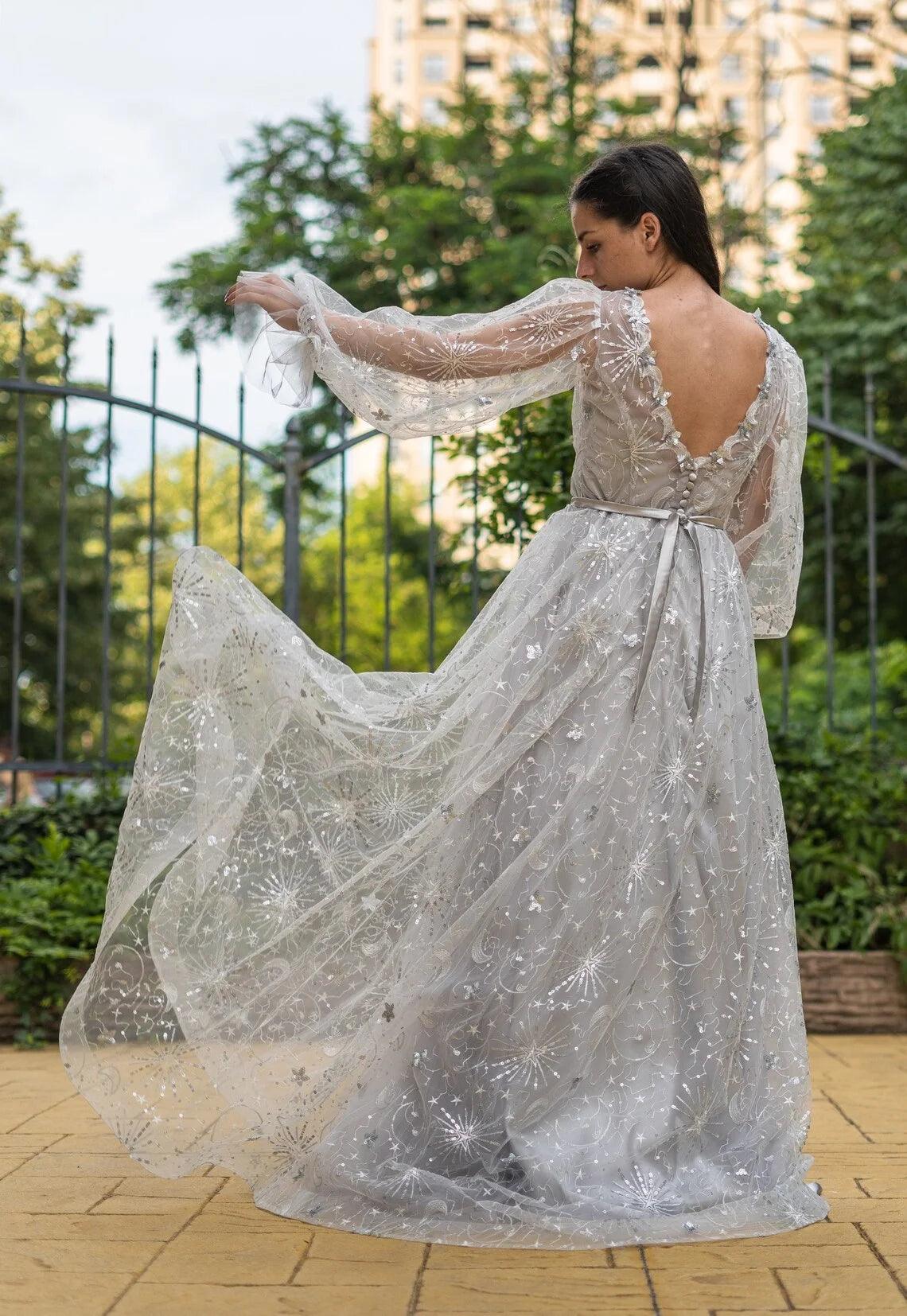 Wrapped in a subtle shade of gray, unique bridal gown with long sleeves exudes sophistication, offering a modern twist on celestial-inspired fashion. The built-in bra cups provide optimal support for the bust, ensuring a comfortable and secure fit throughout your special day. The gown's closure is a testament to artisanal craftsmanship, featuring meticulously placed handmade buttons that add a bespoke touch to the celestial allure. Immerse yourself in the magic of this celestial star gown, where every detail is thoughtfully designed to make your wedding day truly celestial and memorable.