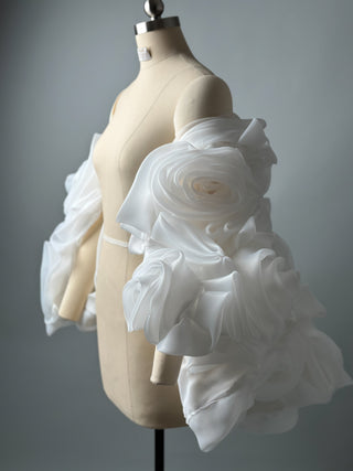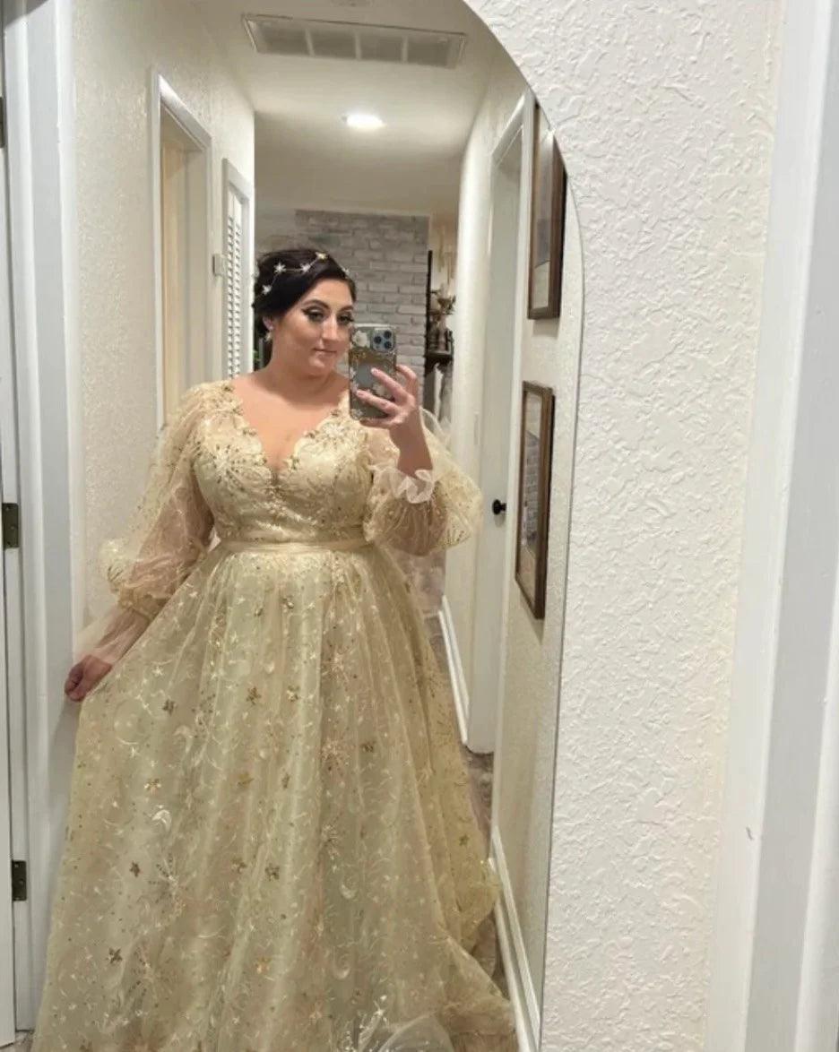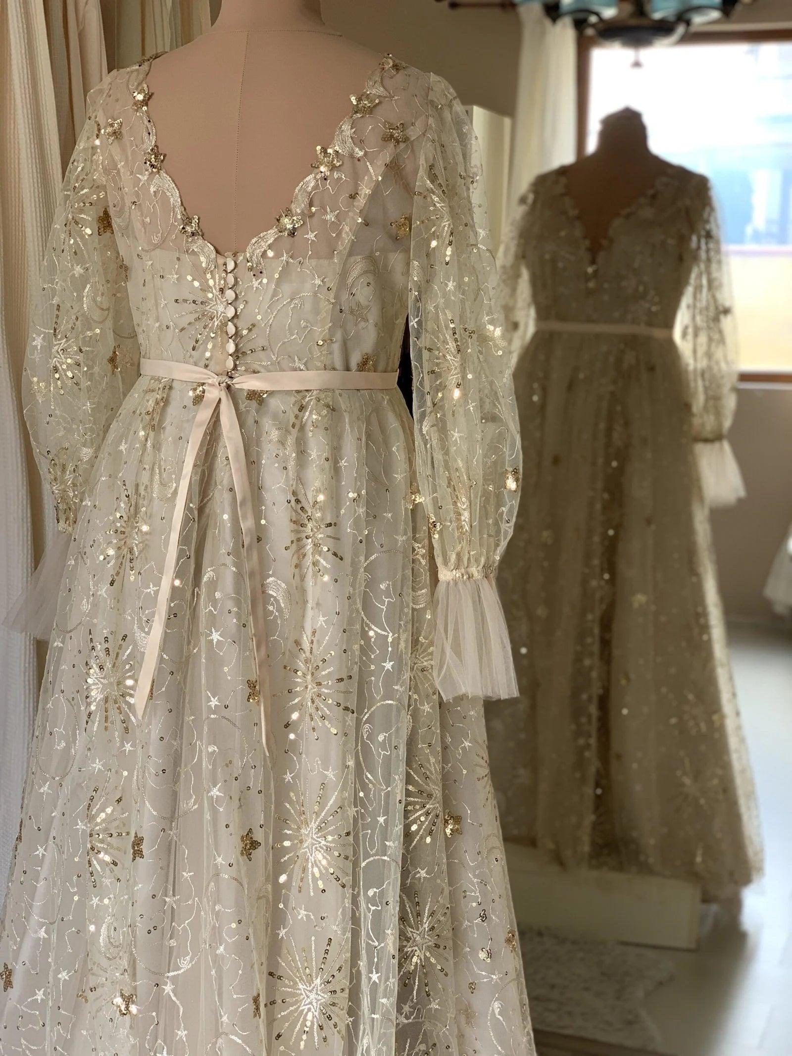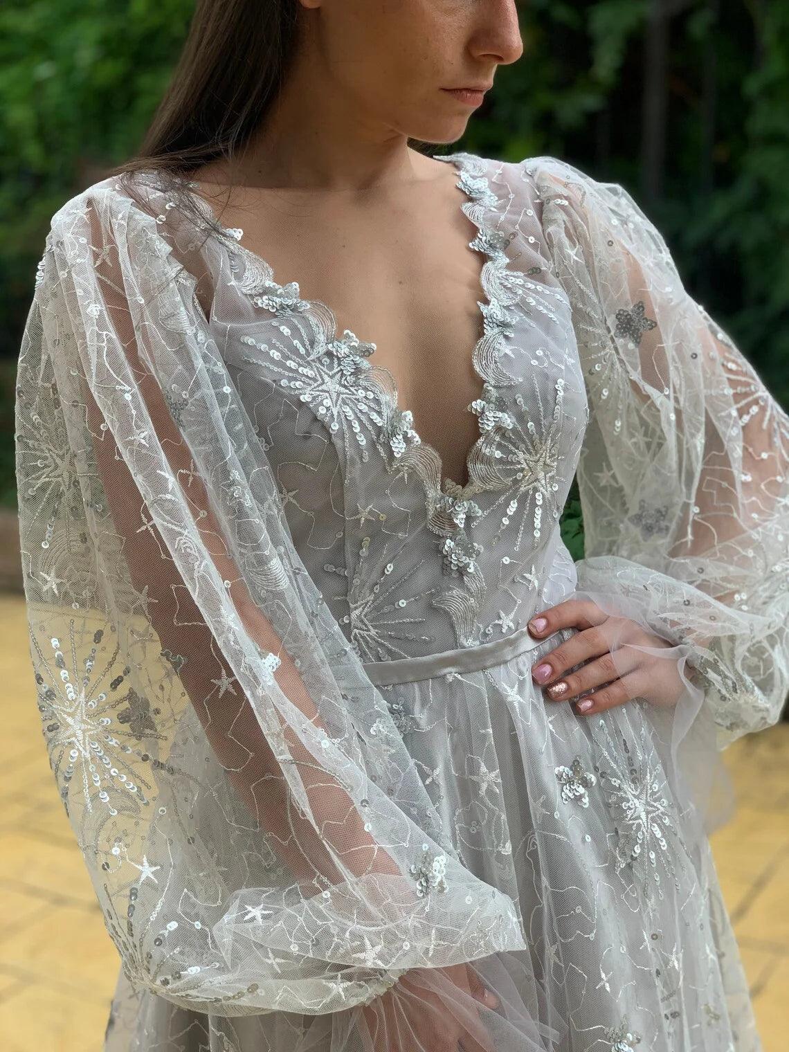 Wrapped in a subtle shade of gray, unique bridal gown with long sleeves exudes sophistication, offering a modern twist on celestial-inspired fashion. The built-in bra cups provide optimal support for the bust, ensuring a comfortable and secure fit throughout your special day. The gown's closure is a testament to artisanal craftsmanship, featuring meticulously placed handmade buttons that add a bespoke touch to the celestial allure. Immerse yourself in the magic of this celestial star gown, where every detail is thoughtfully designed to make your wedding day truly celestial and memorable.