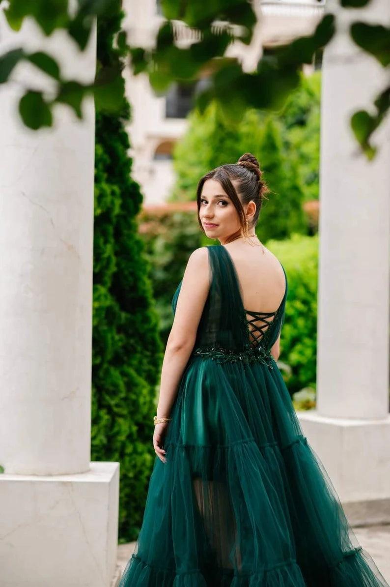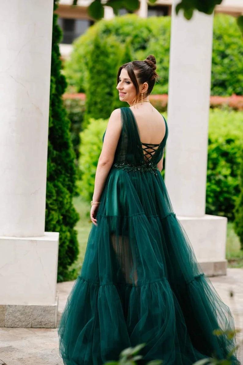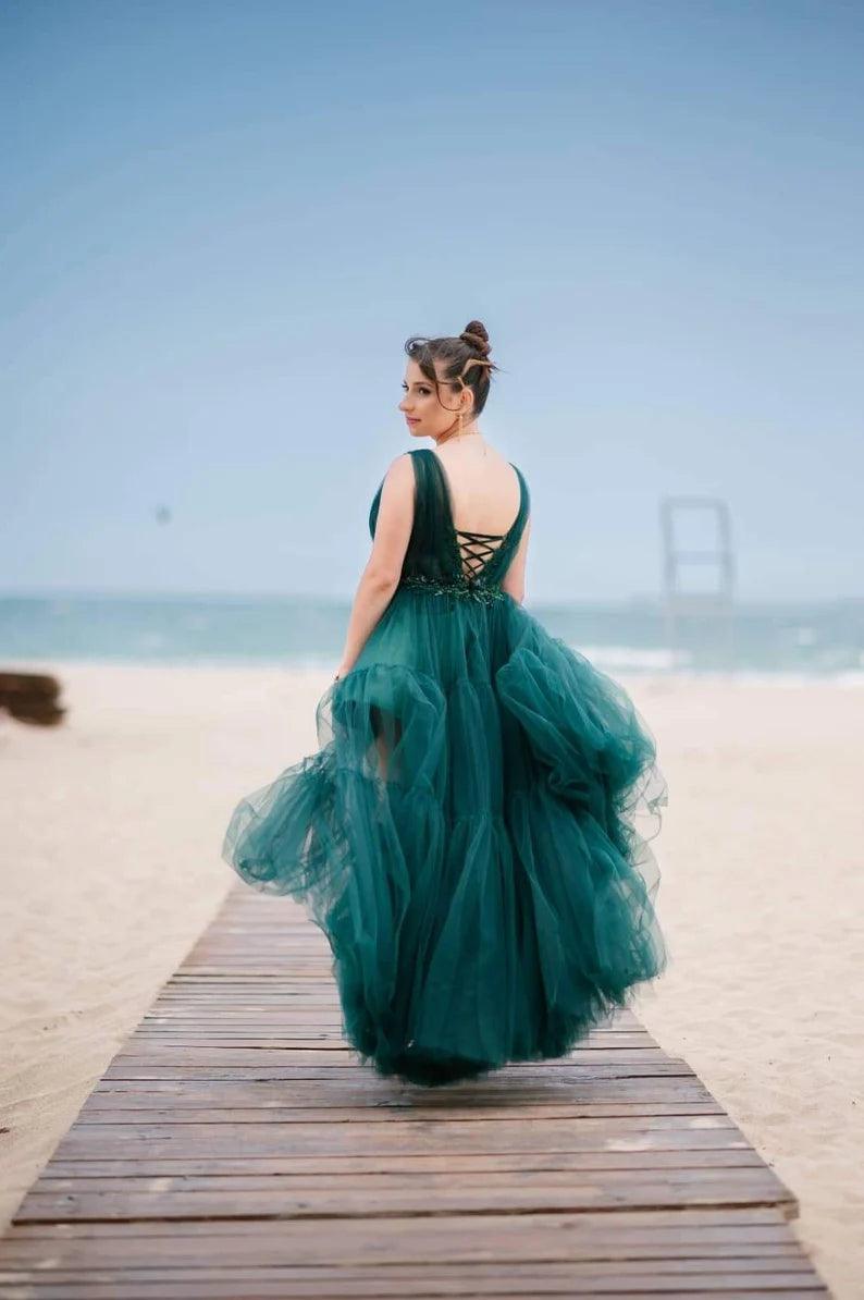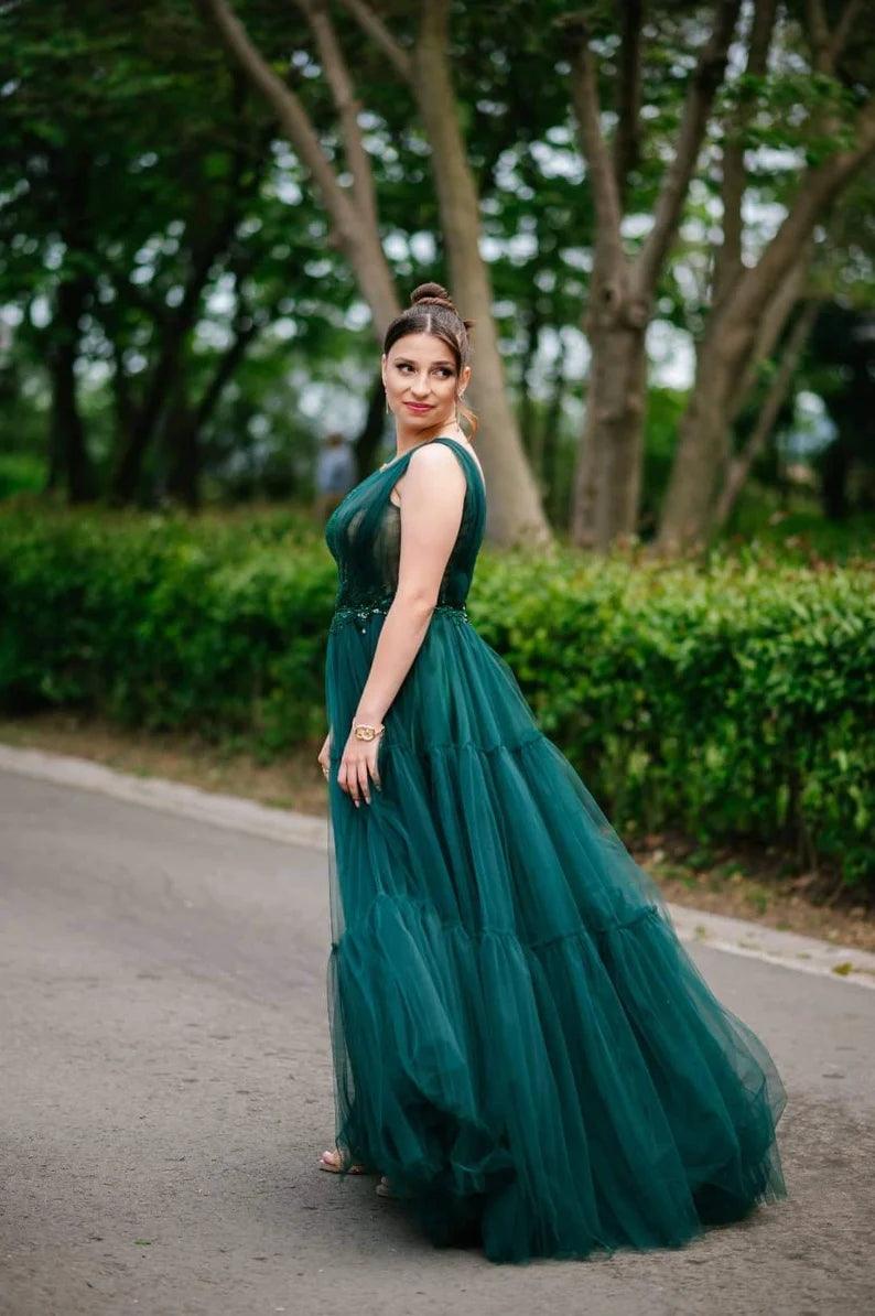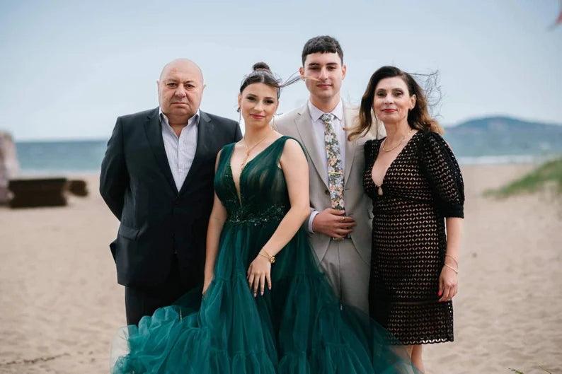Indulge in the enchanting allure of our Fairy Gown featuring a captivating deep V neckline in luxurious emerald green—although, the palette is entirely customizable to your preference! Crafted with meticulous attention to detail, the A-line silhouette boasts hand-cut layers of exquisite tulle, delicately affixed and expertly sewn. Beneath lies a lining of satin. Adorning the bodice is intricate French lace, meticulously applied by skilled hands.
