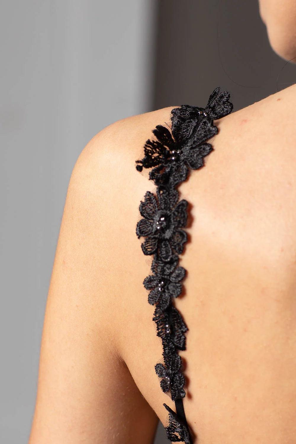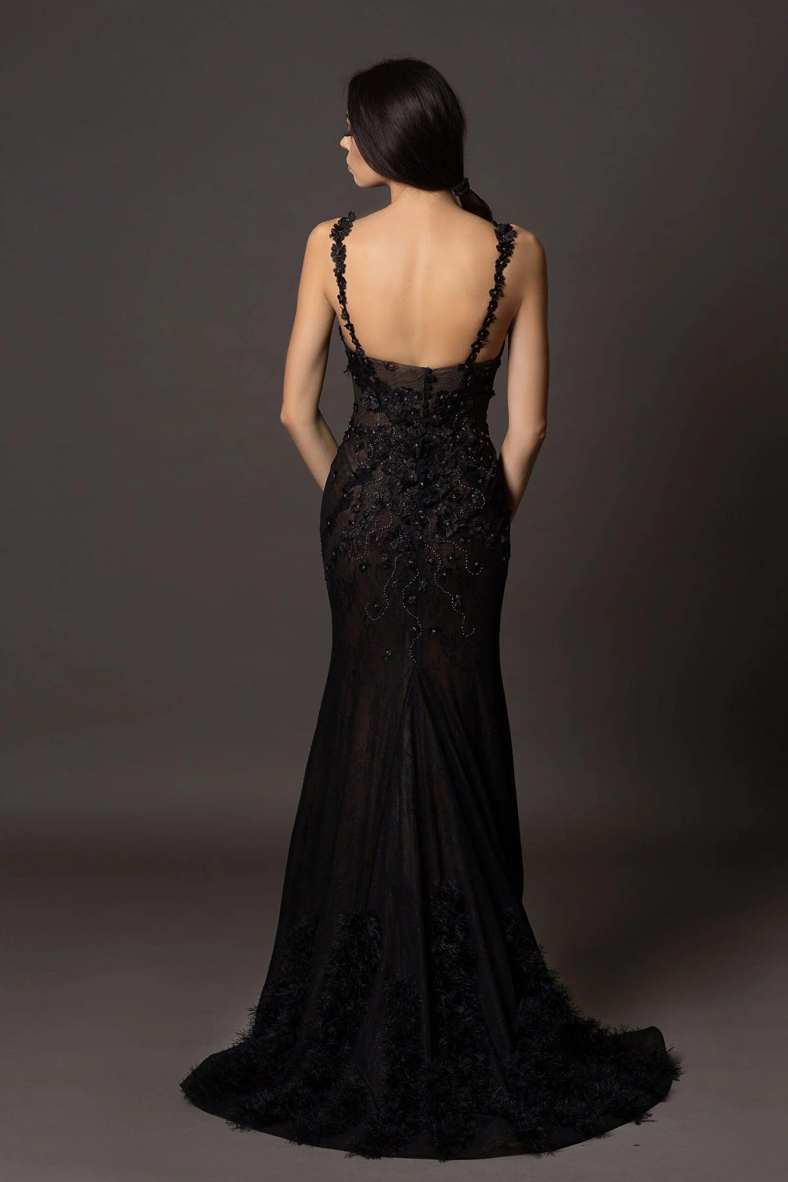 Crafted from black mesh and adorned with delicate lace, this elegant formal gown showcases a Sheath silhouette that reflects countless hours of meticulous handwork. Every intricate detail, from the lace to the pearls, is meticulously sewn by hand, creating a true work of art. The gown boasts a seductive open back, alluring straps, and a graceful train adorned with feather accents, ensuring a show-stopping and unforgettable presence.